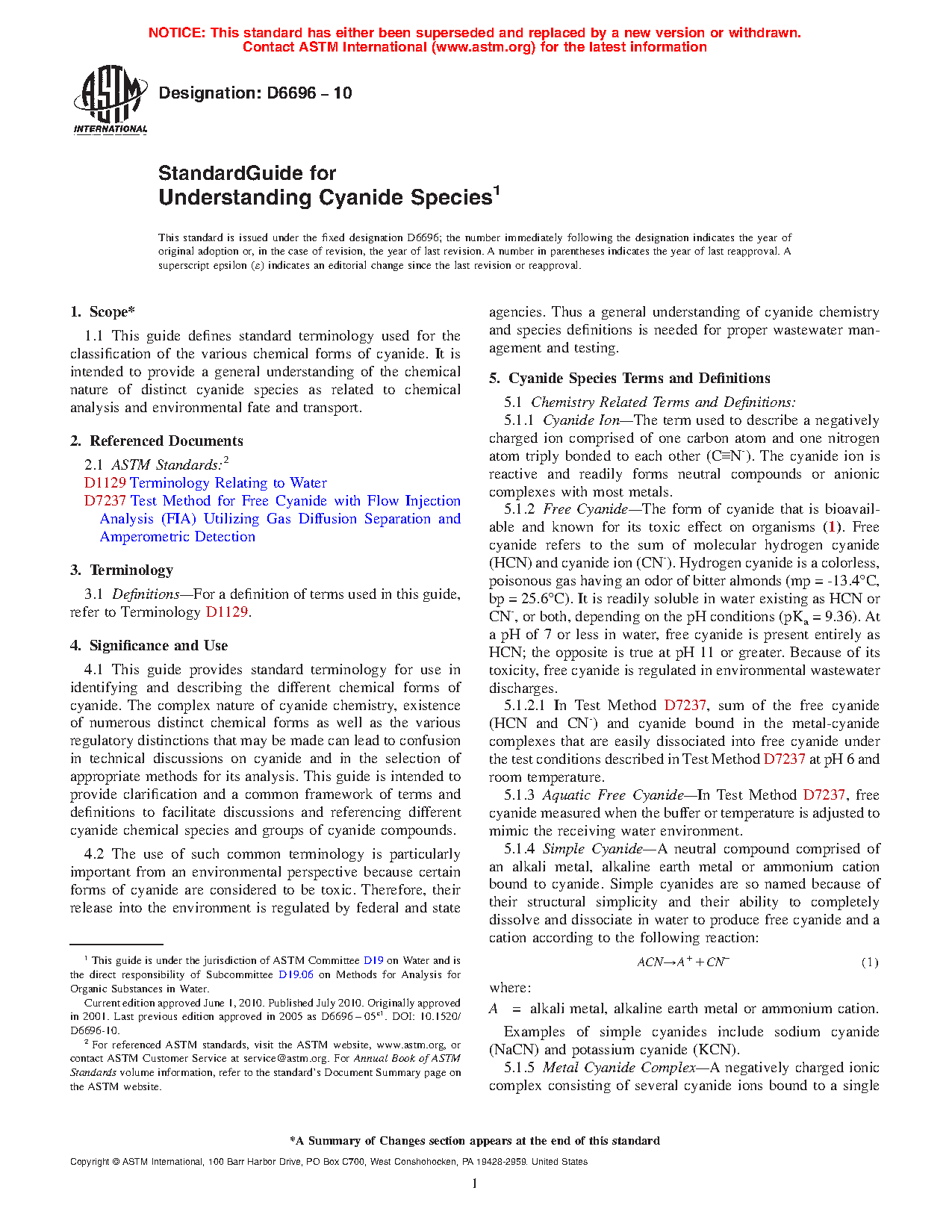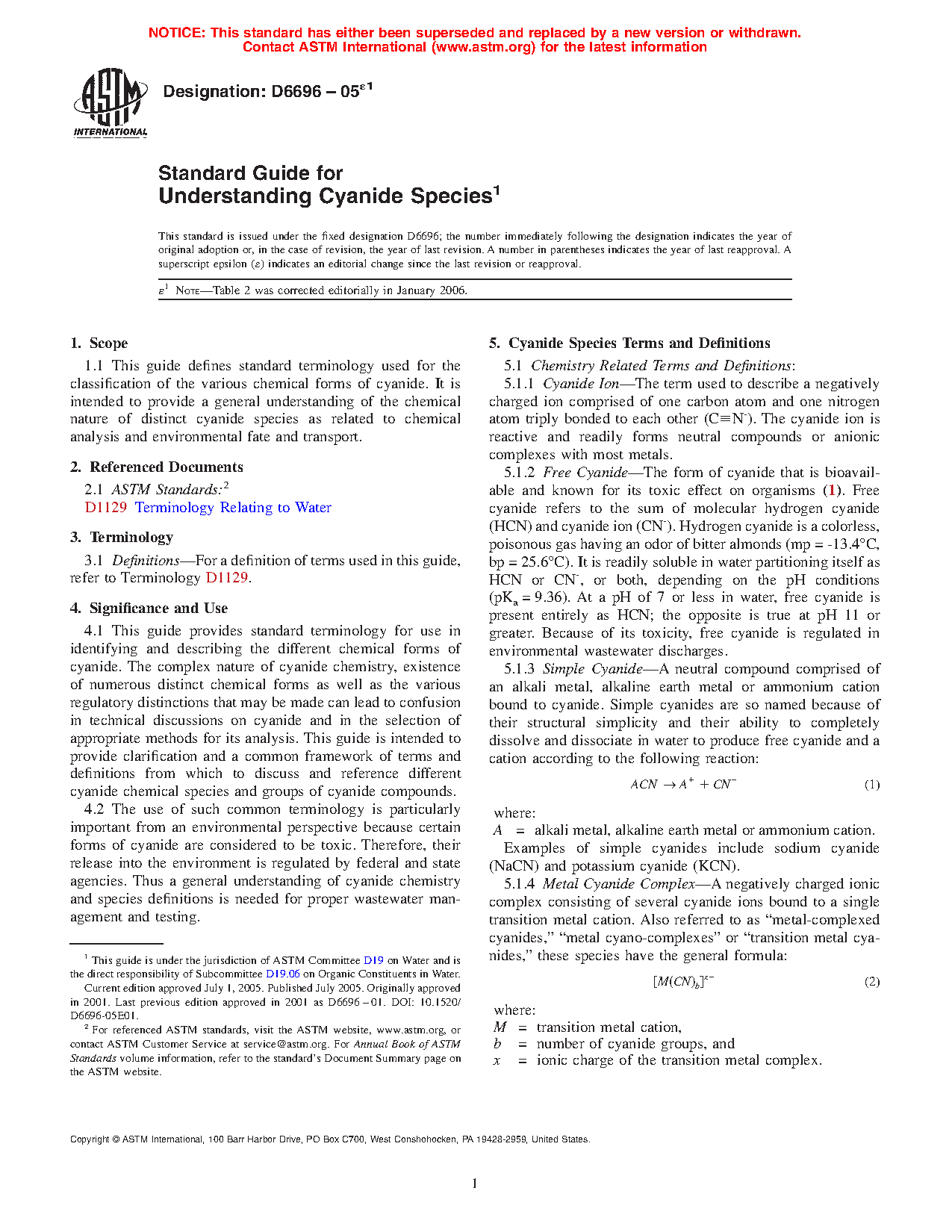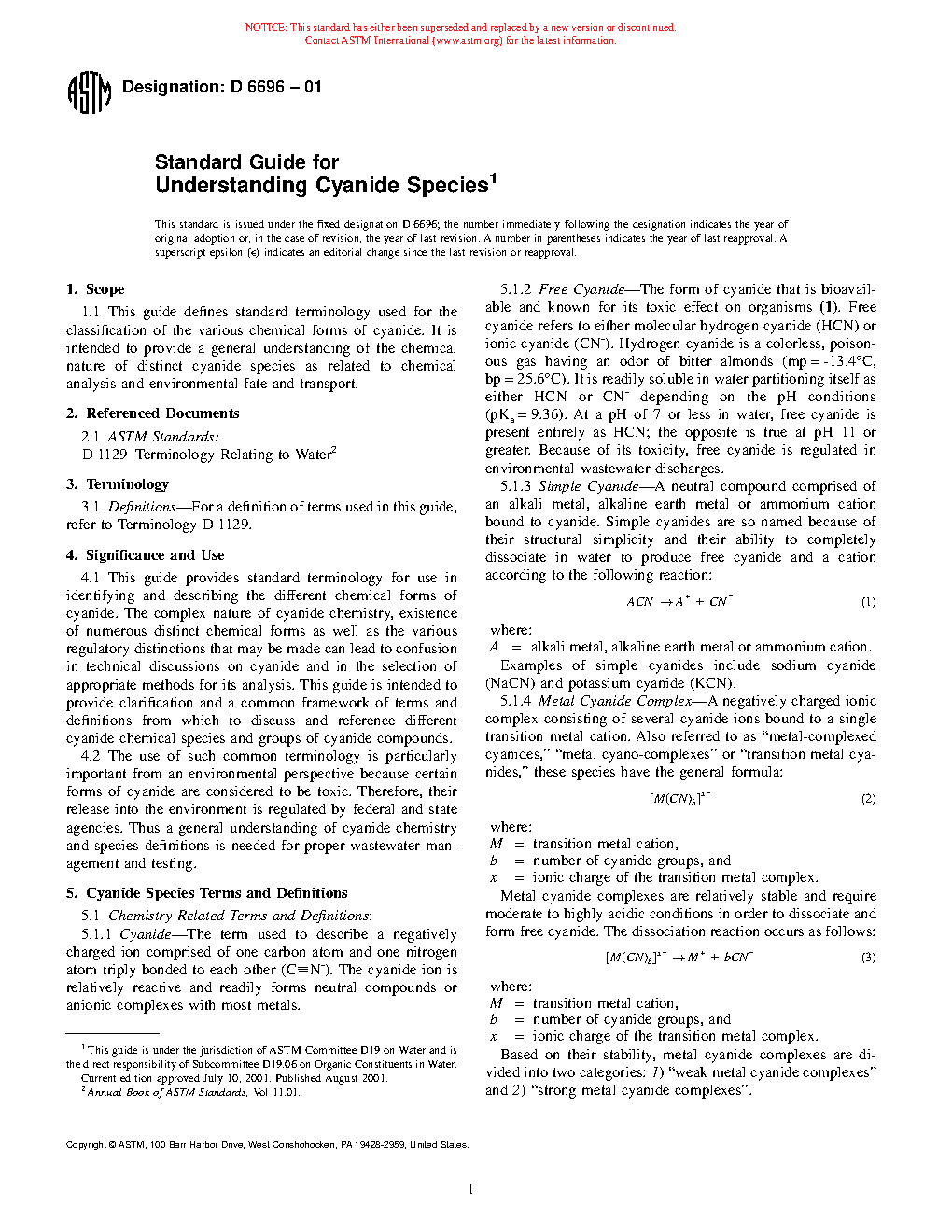 4.2 The use of such common terminology is particularly important from an environmental perspective because certain forms of cyanide are considered to be toxic. Therefore, their release into the environment is regulated by federal and state agencies. Thus a general understanding of cyanide chemistry and species definitions is needed for proper wastewater management and testing.