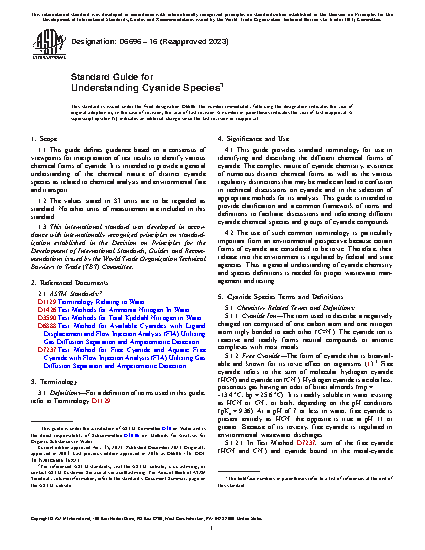 1.1 This guide defines guidance based on a consensus of viewpoints for interpretation of test results to identify various chemical forms of cyanide. It is intended to provide a general understanding of the chemical nature of distinct cyanide species as related to chemical analysis and environmental fate and transport.