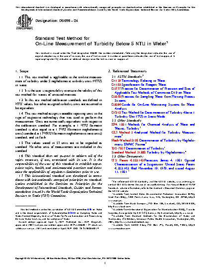 1.1 This test method is applicable to the on-line measurement of turbidity under 5 nephelometric turbidity units (NTU) in water.
