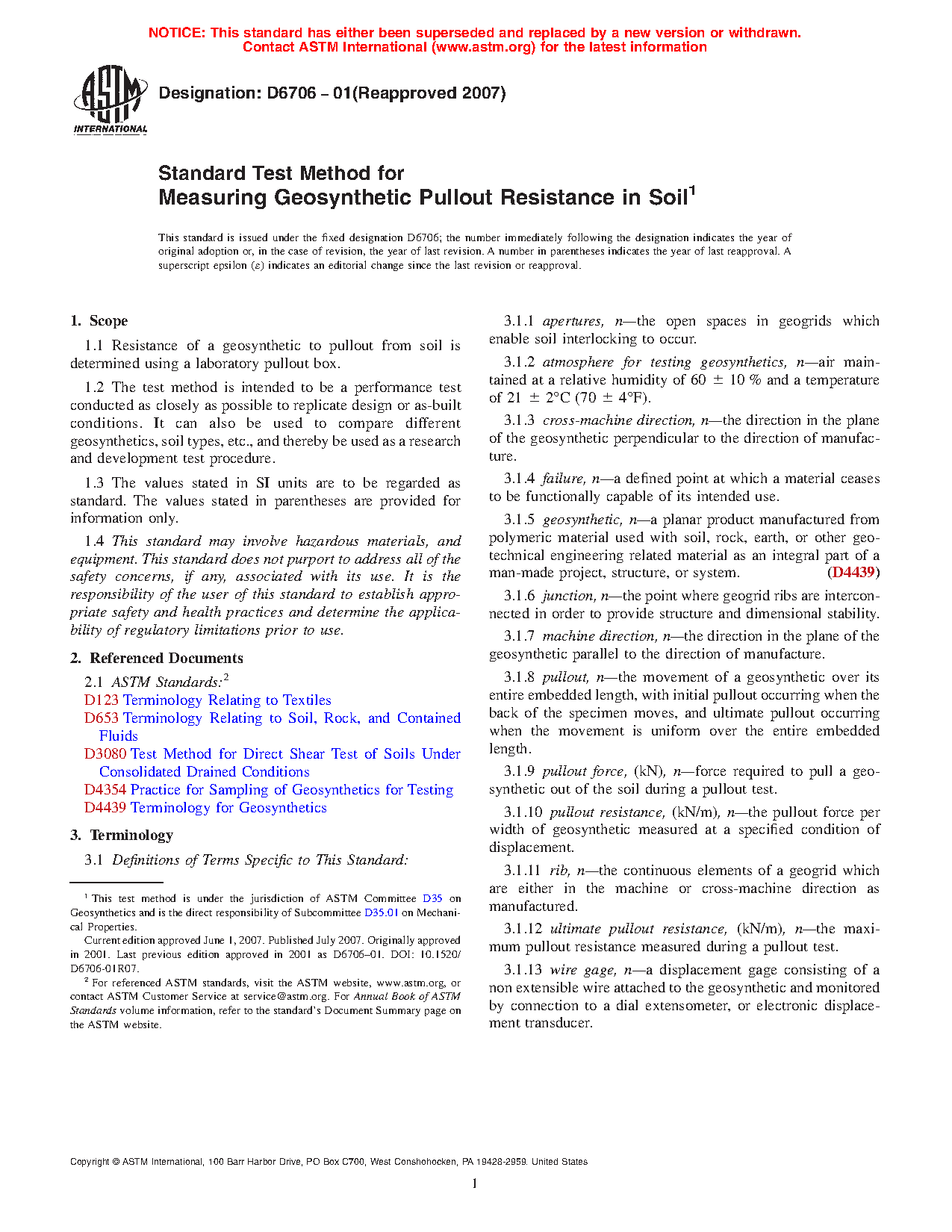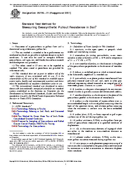 1.1 Resistance of a geosynthetic to pullout from soil is determined using a laboratory pullout box.