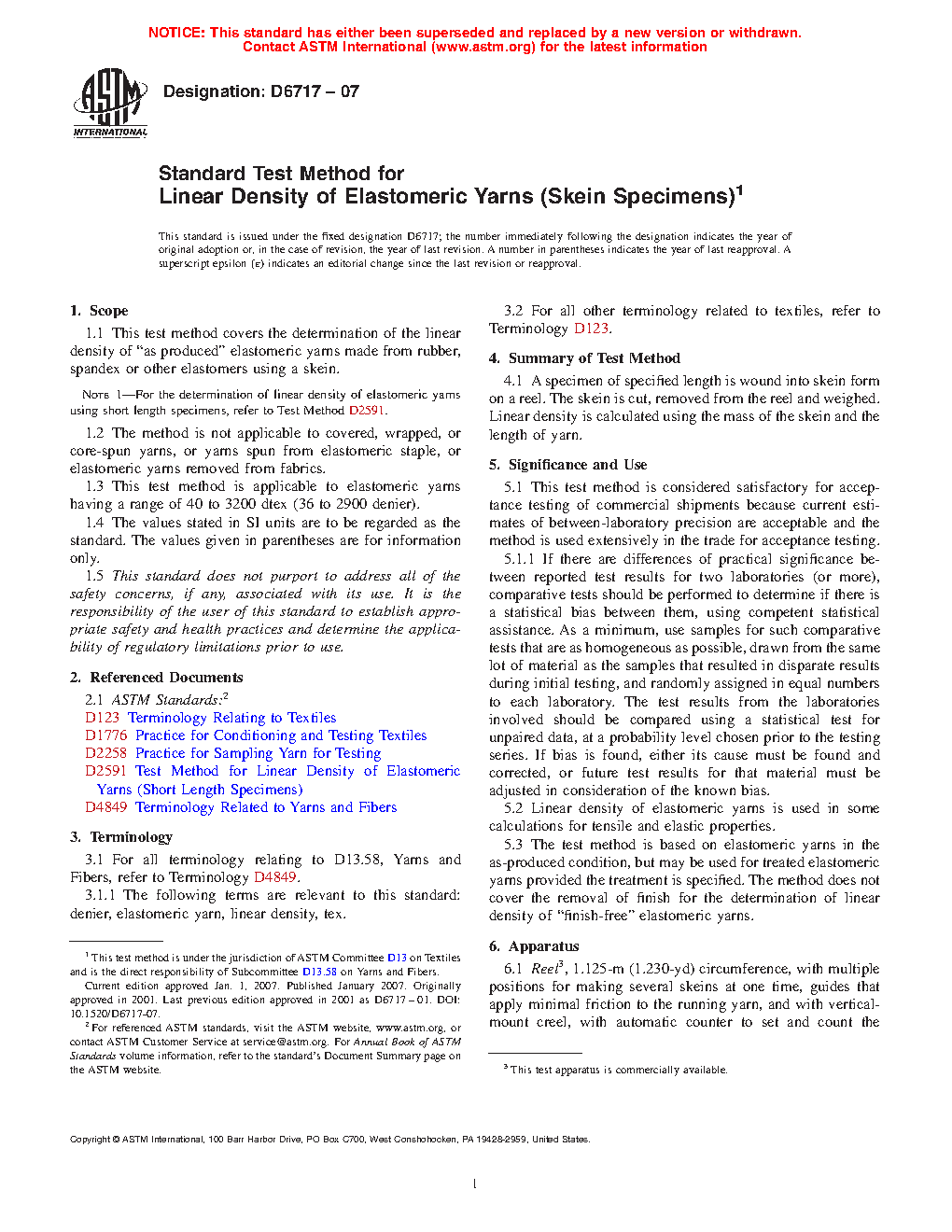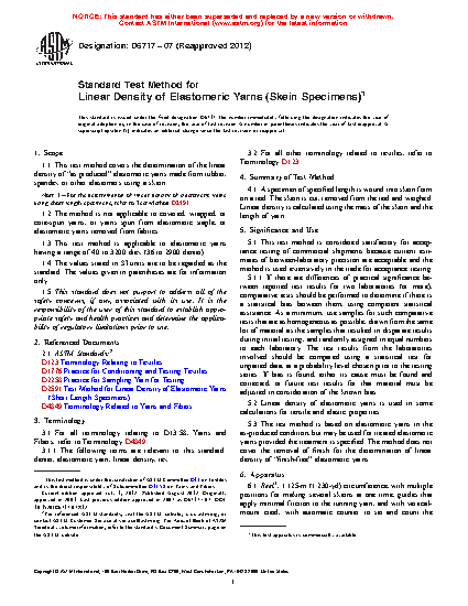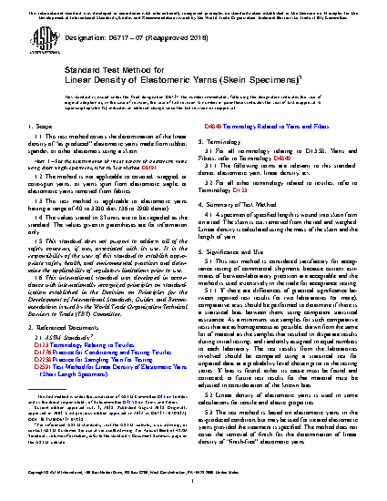 1.1 This test method covers the determination of the linear density of "as produced" elastomeric yarns made from rubber, spandex or other elastomers using a skein.
