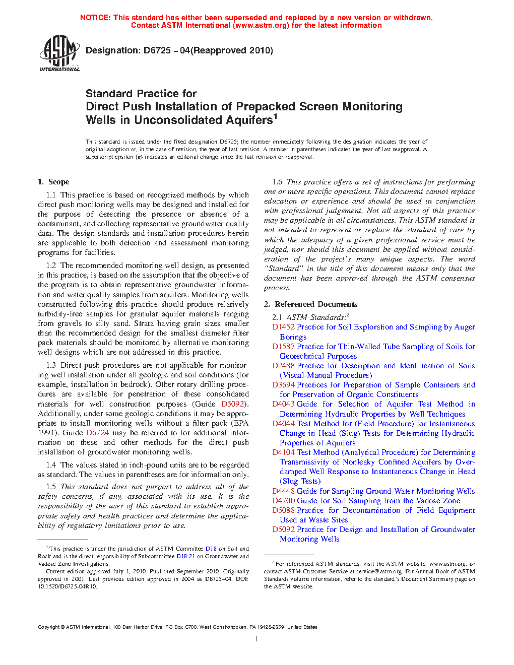 1.1 This practice is based on recognized methods by which direct push monitoring wells may be designed and installed for the purpose of detecting the presence or absence of a contaminant, and collecting representative groundwater quality data. The design standards and installation procedures herein are applicable to both detection and assessment monitoring programs for facilities.