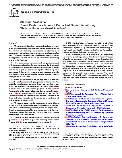 5.1 This practice is intended to provide the user with information on the appropriate methods and procedures for installing prepacked screen monitoring wells by direct push methods. The monitoring wells may be used to obtain representative water quality samples for aqueous phase contaminants or other analytes of interest, either organic or inorganic (3, 6-8). The monitoring wells may also be used to obtain information on the potentiometric surface of the local aquifer and properties of the formation such as hydraulic conductivity or transmissivity.