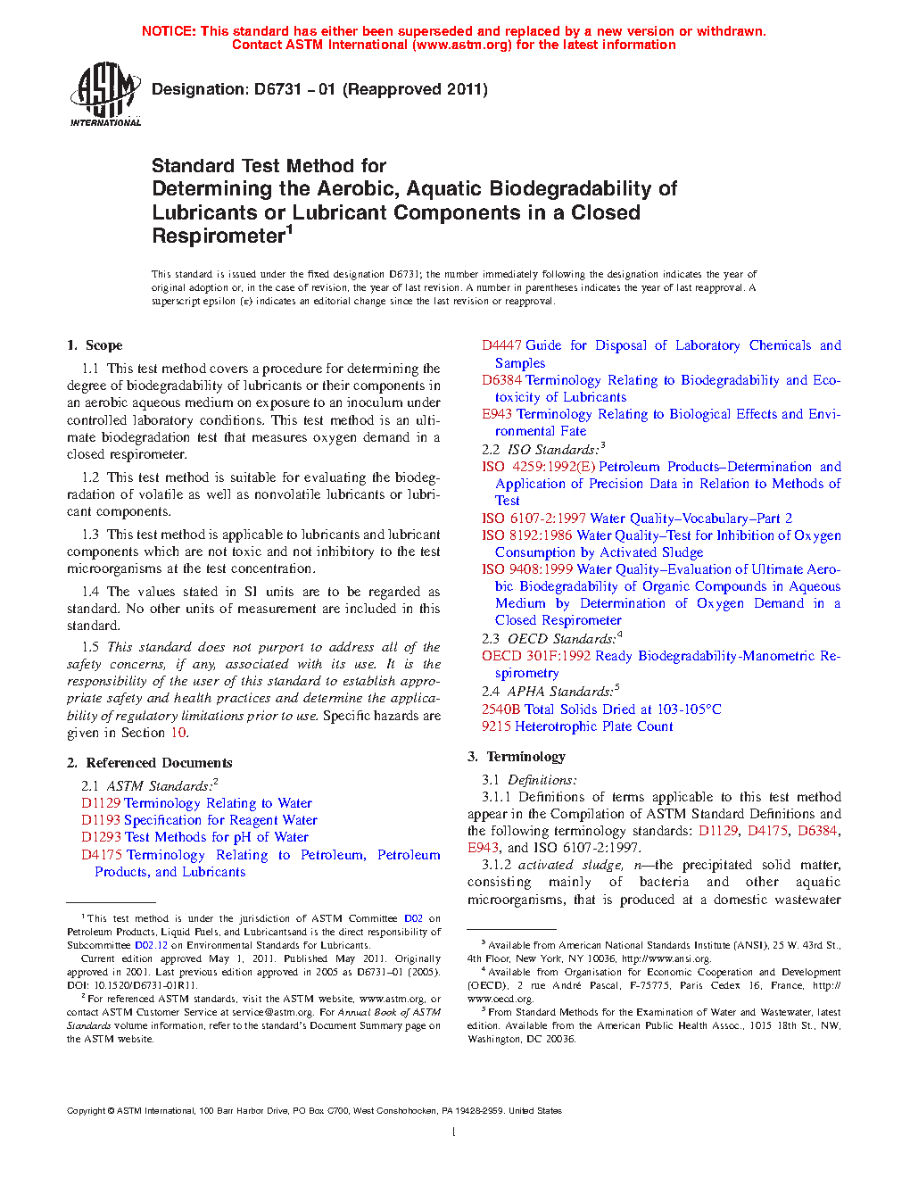 1.1 This test method covers a procedure for determining the degree of biodegradability of lubricants or their components in an aerobic aqueous medium on exposure to an inoculum under controlled laboratory conditions. This test method is an ultimate biodegradation test that measures oxygen demand in a closed respirometer.