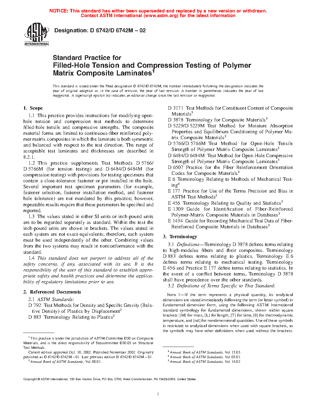 1.1 This practice provides instructions for modifying open-hole tension and compression test methods to determine filled-hole tensile and compressive strengths. The composite material forms are limited to continuous-fiber reinforced polymer matrix composites in which the laminate is both symmetric and balanced with respect to the test direction. The range of acceptable test laminates and thicknesses are described in 8.2.1.