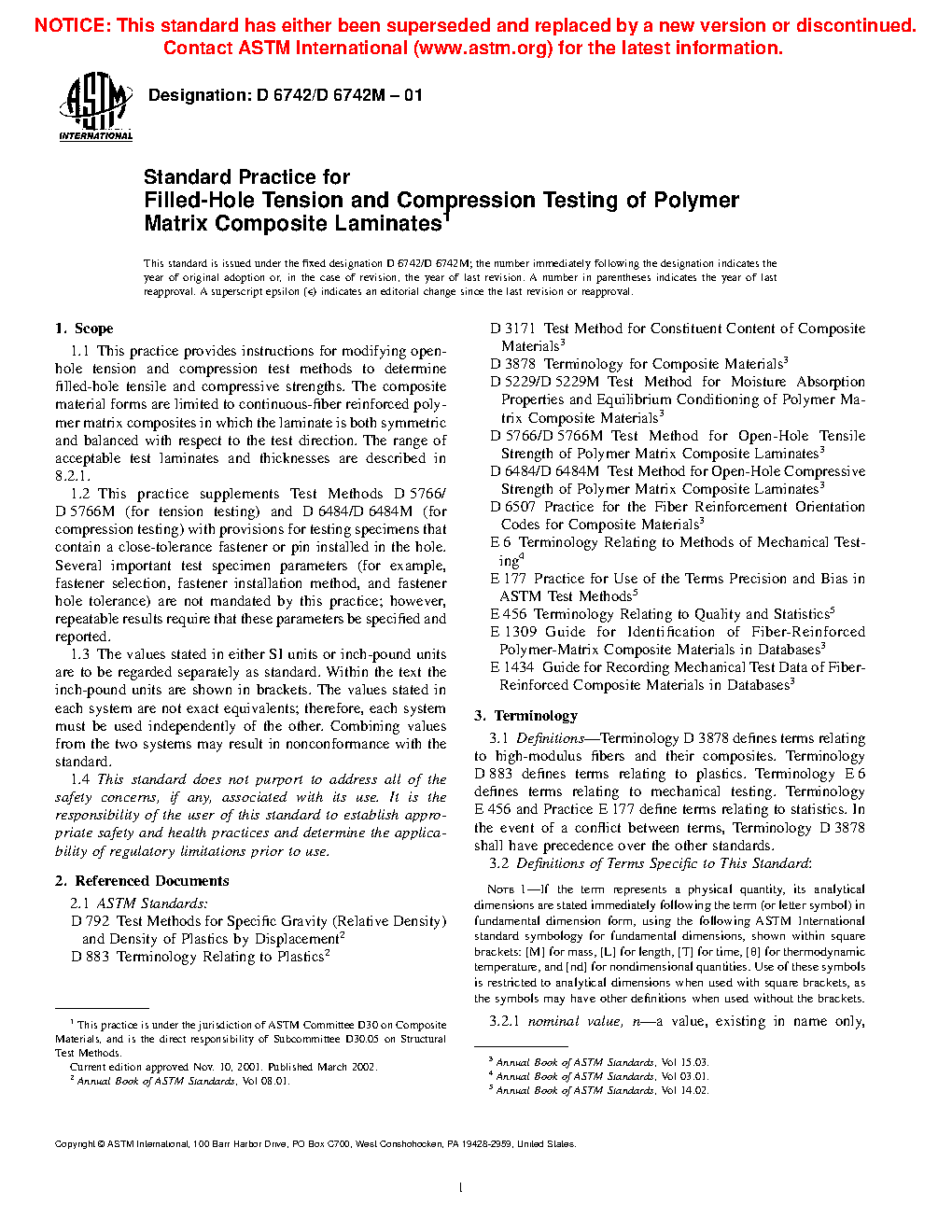 1.2 This practice supplements Test Methods D 5766/D 5766M (for tension testing) and D 6484/D 6484M (for compression testing) with provisions for testing specimens that contain a close-tolerance fastener or pin installed in the hole. Several important test specimen parameters (for example, fastener selection, fastener installation method, and fastener hole tolerance) are not mandated by this practice; however, repeatable results require that these parameters be specified and reported.