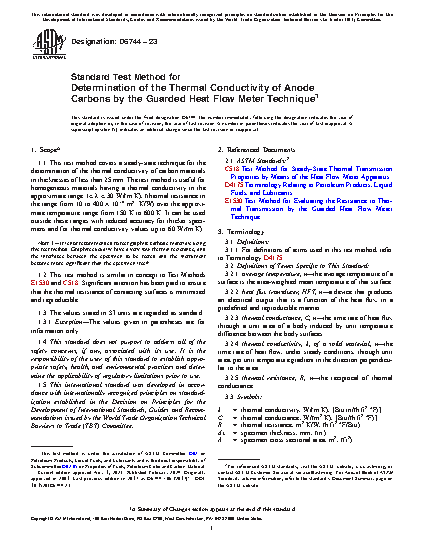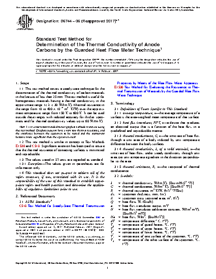 1.1 This test method covers a steady-state technique for the determination of the thermal conductivity of carbon materials in thicknesses of less than 25 mm. The test method is useful for homogeneous materials having a thermal conductivity in the approximate range 1 30 W/(mK), (thermal resistance in the range from 10 to 400 104 m2 K/W) over the approximate temperature range from 150 to 600 K. It can be used outside these ranges with reduced accuracy for thicker specimens and for thermal conductivity values up to 60 W/(mK).