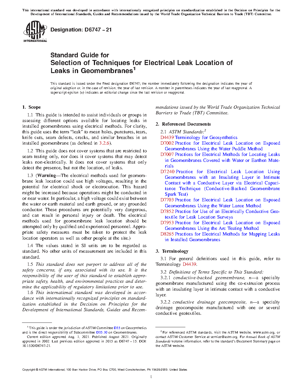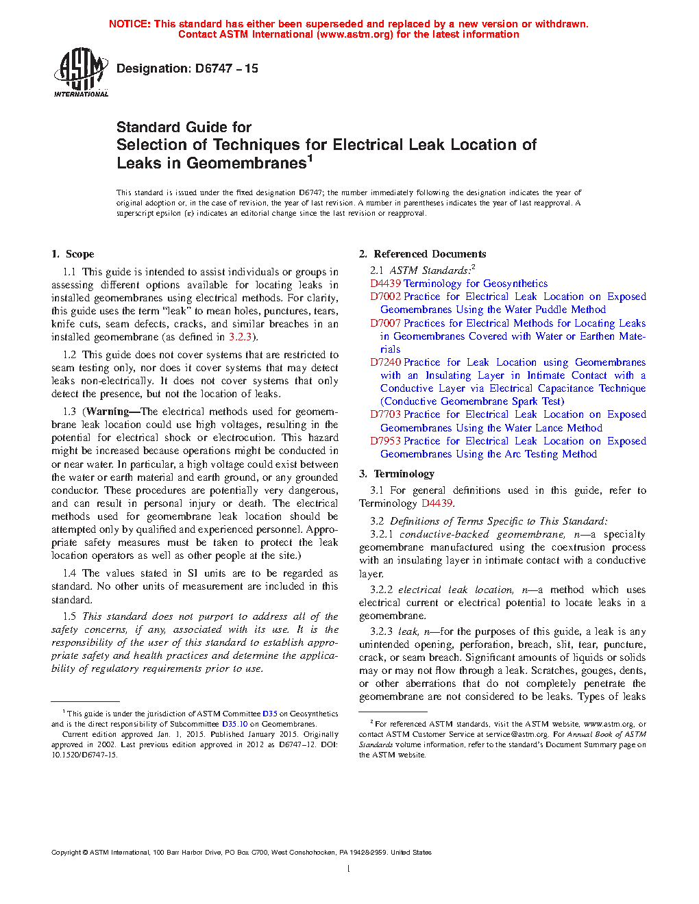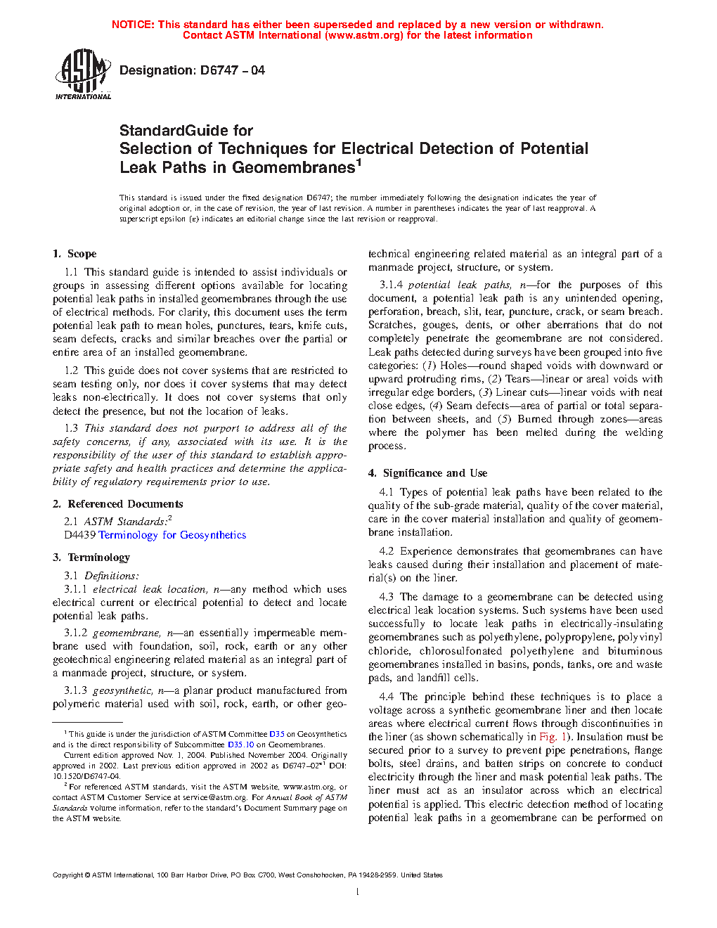 1.1 This standard guide is intended to assist individuals or groups in assessing different options available for locating potential leak paths in installed geomembranes through the use of electrical methods. For clarity, this document uses the term potential leak path to mean holes, punctures, tears, knife cuts, seam defects, cracks and similar breaches over the partial or entire area of an installed geomembrane.