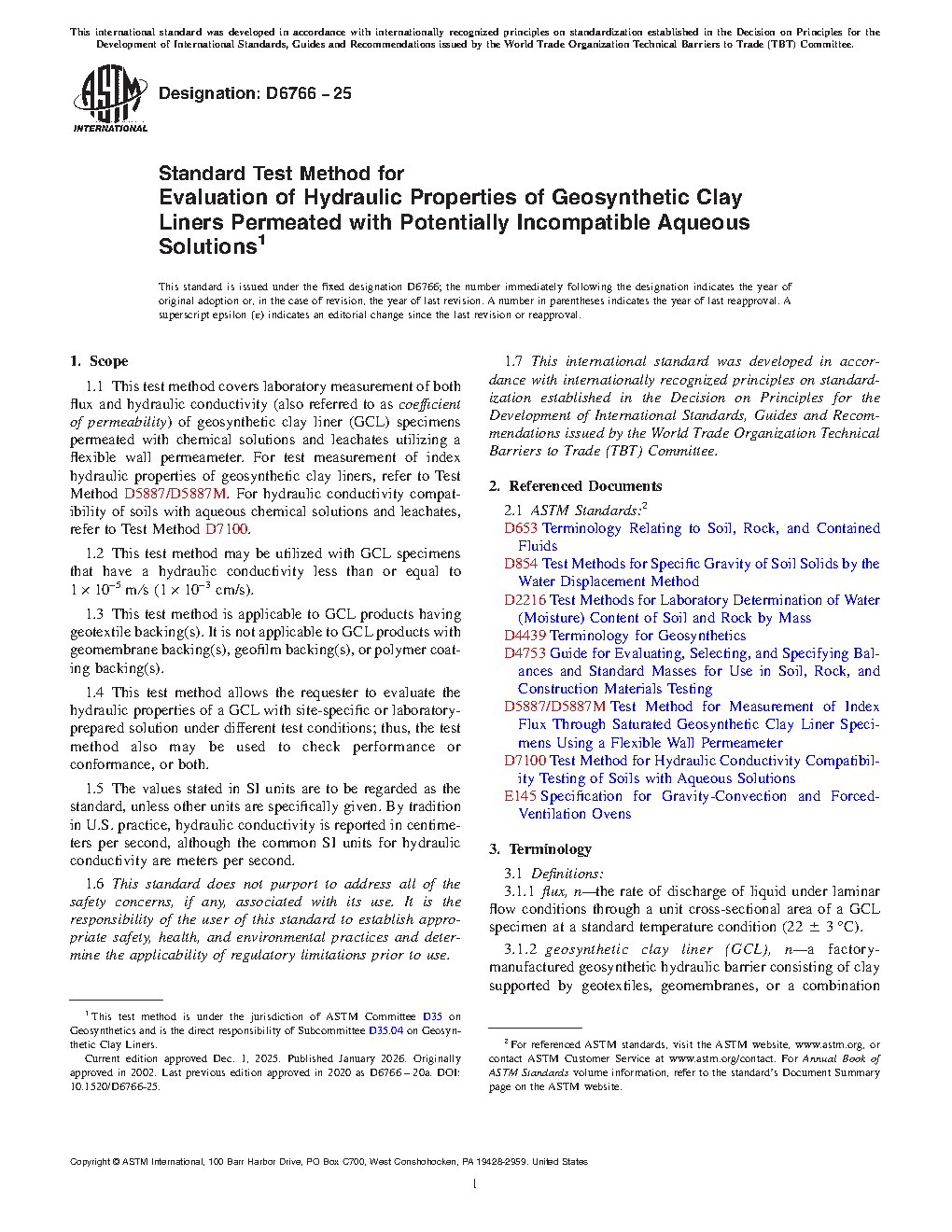 1.1 This test method covers laboratory measurement of both flux and hydraulic conductivity (also referred to as coefficient of permeability) of geosynthetic clay liner (GCL) specimens permeated with chemical solutions and leachates utilizing a flexible wall permeameter. For test measurement of index hydraulic properties of geosynthetic clay liners, refer to Test Method D5887/D5887M. For hydraulic conductivity compatibility of soils with aqueous chemical solutions and leachates, refer to Test Method D7100.