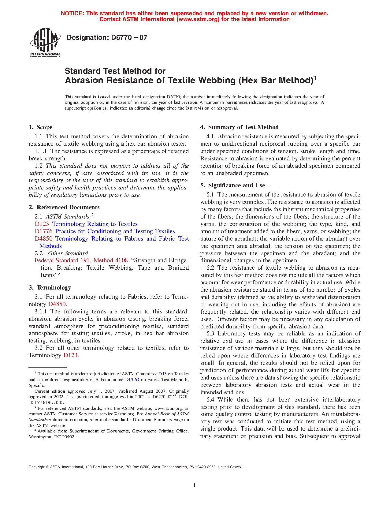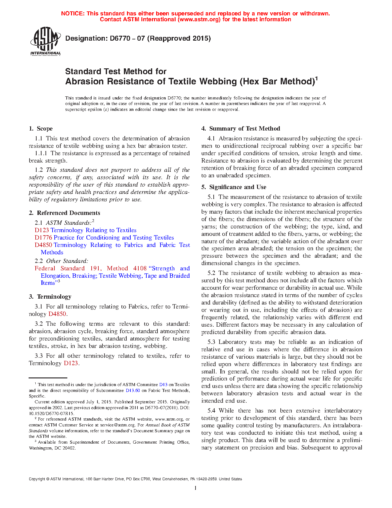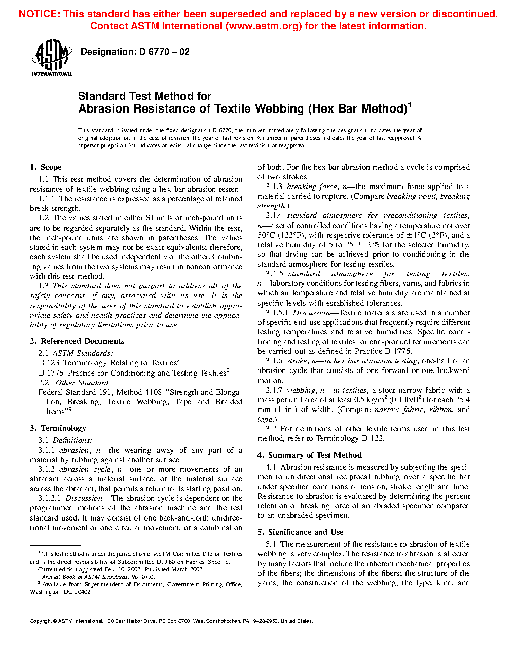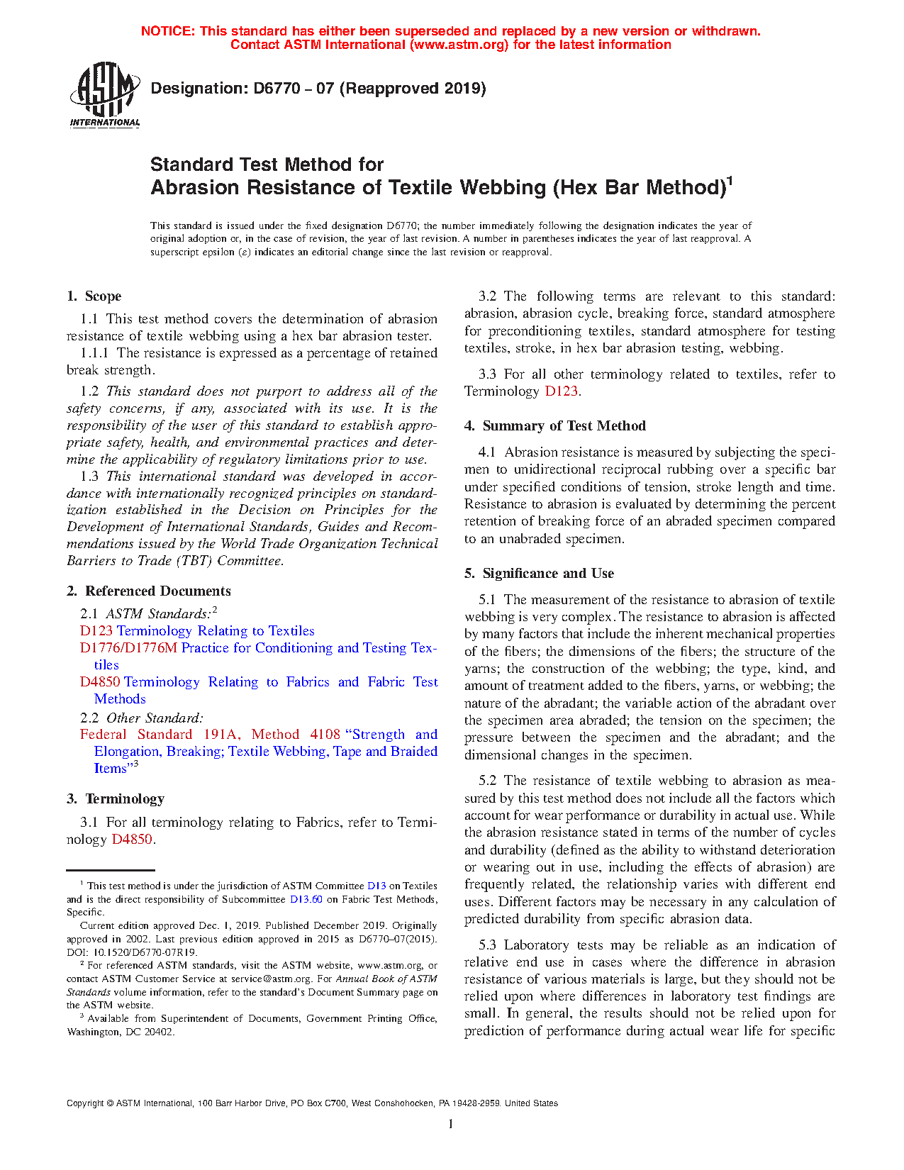 5.2 The resistance of textile webbing to abrasion as measured by this test method does not include all the factors which account for wear performance or durability in actual use. While the abrasion resistance stated in terms of the number of cycles and durability (defined as the ability to withstand deterioration or wearing out in use, including the effects of abrasion) are frequently related, the relationship varies with different end uses. Different factors may be necessary in any calculation of predicted durability from specific abrasion data.