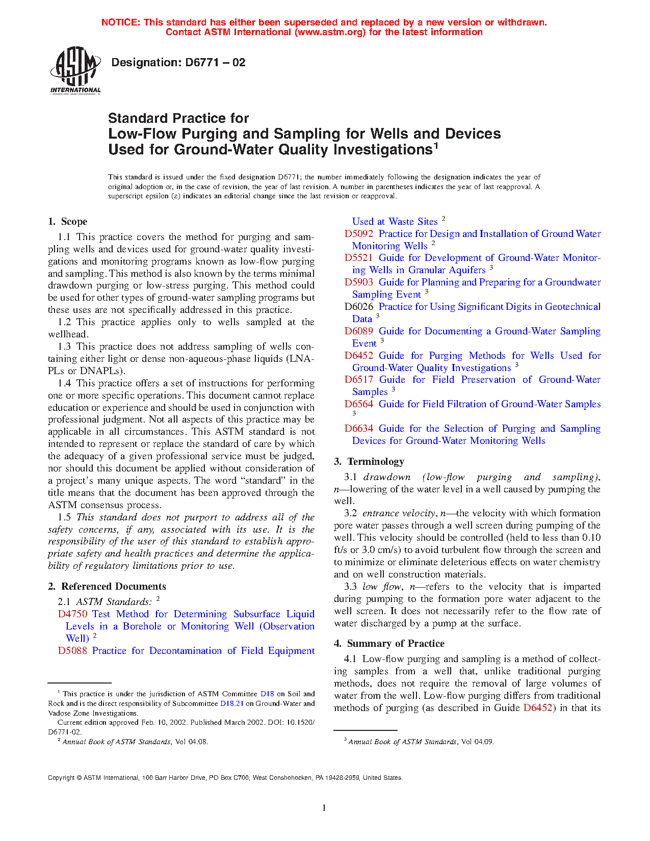 Note 1: This Standard is not intended to replace or supersede any regulatory requirements, standard operating procedure (SOP), quality assurance project plan (QAPP), ground water sampling and analysis plan (GWSAP) or site-specific regulatory permit requirements. The procedures described in this Standard may be used in conjunction with regulatory requirements, SOPs, QAPPs, GWSAPs or permits where allowed by the authority with jurisdiction.