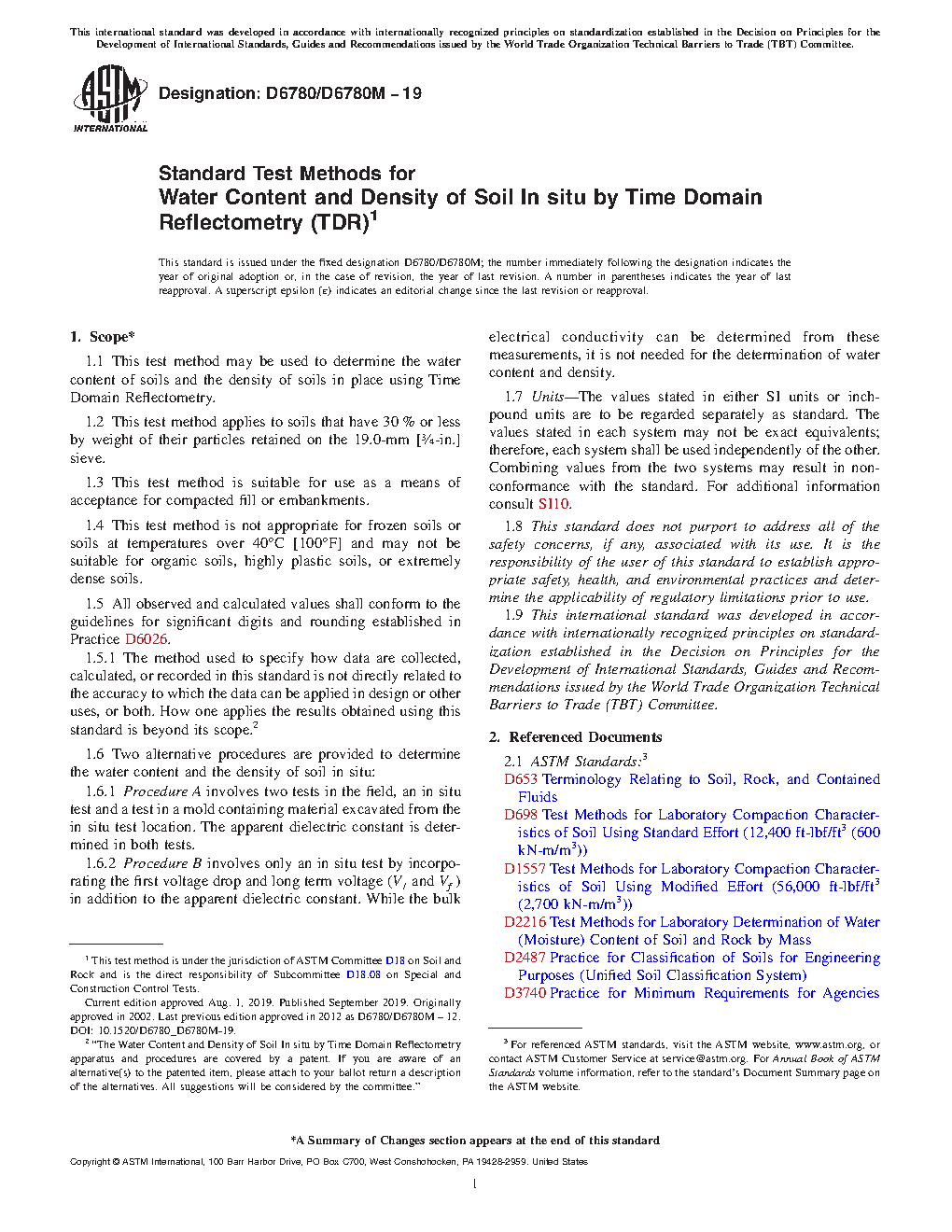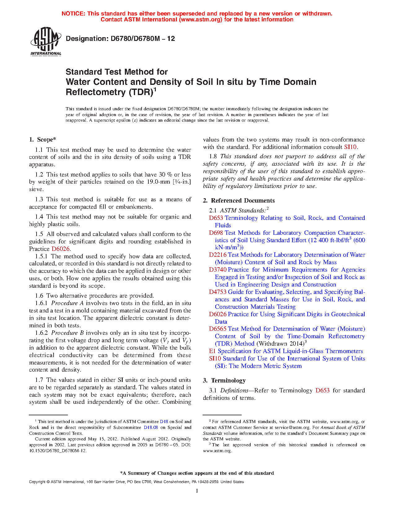 5.2 Time domain reflectometry (TDR) measures the apparent dielectric constant (Procedure A) and the apparent dielectric constant, first voltage drop and long term voltage (V1 and Vf) (Procedure B) of soil. The apparent dielectric constant is affected significantly by the water content and density of soil, and to a lesser extent by the chemical composition of soil and pore water, and by temperature. The first voltage drop and long term voltage (V1 and Vf) are affected significantly by the water content, density, and the chemical composition of the in situ pore water, and to a lesser extent the chemical composition of the soil solids. This test method measures the gravimetric water content and makes use of a different relationship between the electrical properties and water content from Test Method D6565 which measures the volumetric water content.