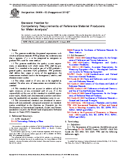 1.2 This practice establishes the quality system requirements in accordance with which waters RMs shall be produced. It is intended to be used as part of a RM producer’s general quality assurance (QA) procedures. RM producers shall define their scope in terms of the application, the measurement methods used in the homogeneity, stability, and characterization studies.