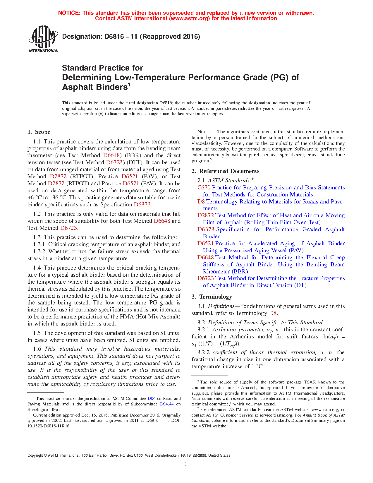 1.1 This practice covers the calculation of low-temperature properties of asphalt binders using data from the bending beam rheometer (see Test Method D6648) (BBR) and the direct tension tester (see Test Method D6723) (DTT). It can be used on data from unaged material or from material aged using Test Method D2872 (RTFOT), Practice D6521 (PAV), or Test Method D2872 (RTFOT) and Practice D6521 (PAV). It can be used on data generated within the temperature range from +6 °C to –36 °C. This practice generates data suitable for use in binder specifications such as Specification D6373.