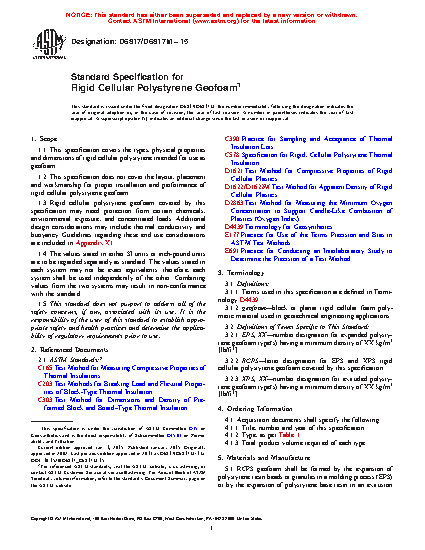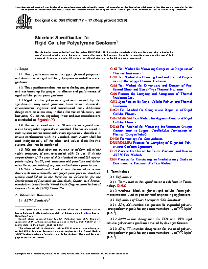 This specification presents the types, physical properties, and dimensions of rigid cellular polystyrene (RCPS) intended for use as geofoam. This specification, however, does not address the layout, placement, and workmanship for proper installation and performance of the geofoams. RCPS geofoams shall be formed by the expansion of polystyrene resin beads or granules in a molding process (EPS), or by the expansion of polystyrene base resin in an extrusion process (XPS). They may also be manufactured with reprocessed polystyrene foam (regrind). The RCPS geofoams shall meet combustibility and curing requirements and, when tested, shall adhere to physical property requirements such as dimensions and density, compressive resistance, flexural strength, and oxygen index. Final products should also meet surface damage, volume damage, and UV degradation limits.