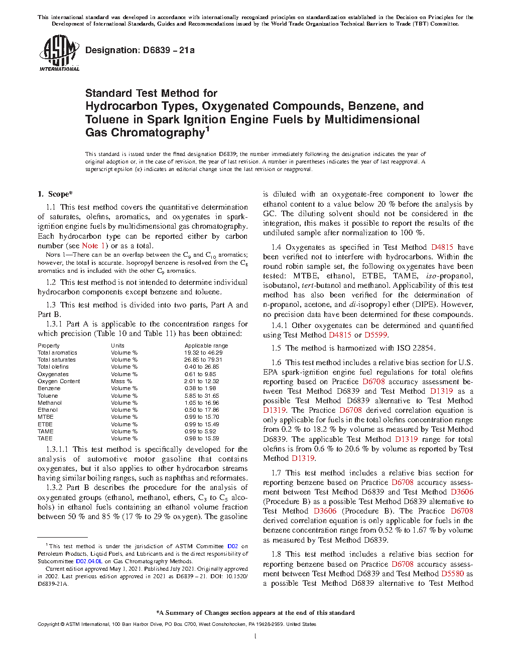 1.11 This test method includes a relative bias section for reporting total aromatics based on Practice D6708 accuracy assessment between Test Method D6839 and Test Method D5580 as a possible Test Method D6839 alternative to Test Method D5580. The Practice D6708 derived correlation equation is only applicable for fuels in the total aromatics concentration range from 14.3 % to 31.2 % by volume as measured by Test Method D6839.