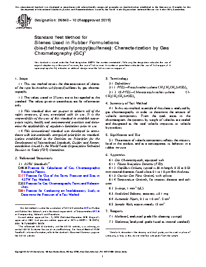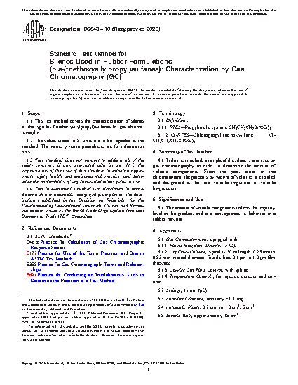 1.1 This test method covers the characterization of silanes of the type bis-(triethoxysilylpropyl)sulfanes by gas chromatography.