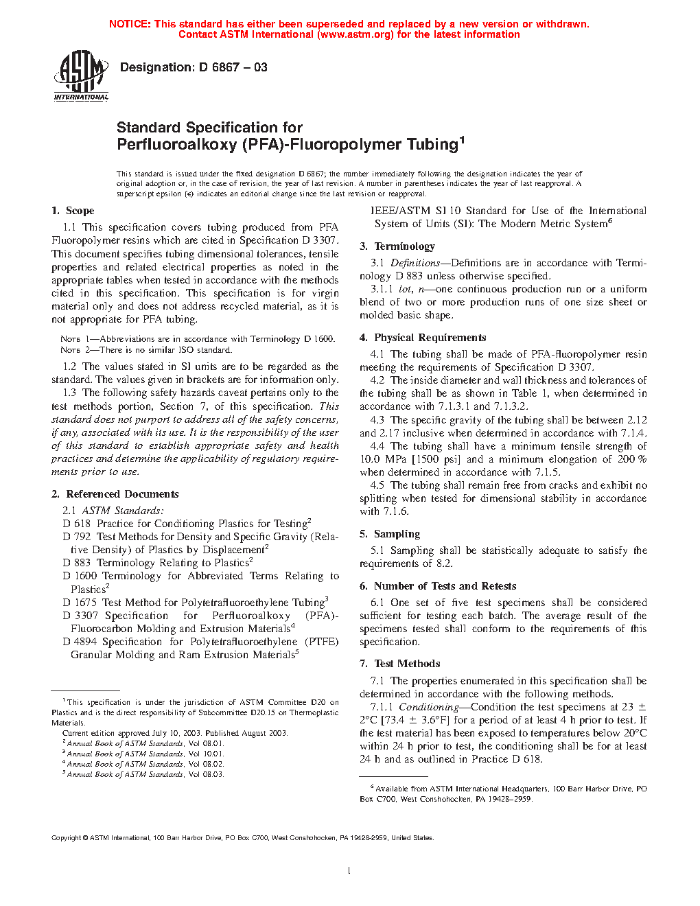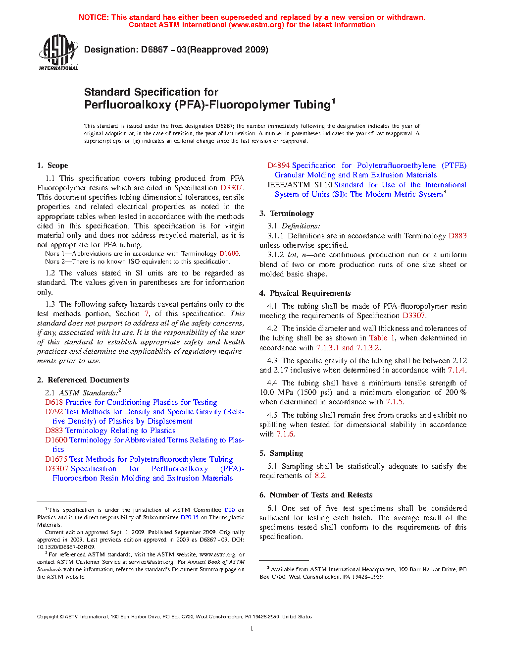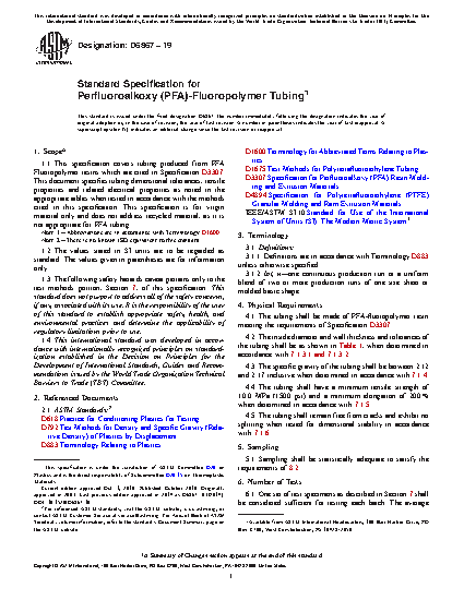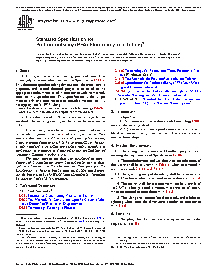 1.1 This specification covers tubing produced from PFA Fluoropolymer resins which are cited in Specification D3307. This document specifies tubing dimensional tolerances, tensile properties and related electrical properties as noted in the appropriate tables when tested in accordance with the methods cited in this specification. This specification is for virgin material only and does not address recycled material, as it is not appropriate for PFA tubing.