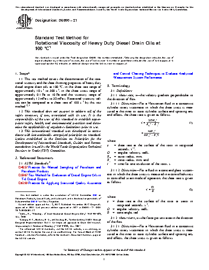 1.1 This test method covers the determination of the rotational viscosity and the shear thinning properties of heavy duty diesel engine drain oils at 100 °C, in the shear rate range of approximately 10 s-1 to 300 s-1, in the shear stress range of approximately 0.1 Pa to 10 Pa and the viscosity range of approximately 12 mPa·s to 35 mPa·s. Rotational viscosity values can be compared at a shear rate of 100 s-1 by this test method.2,3