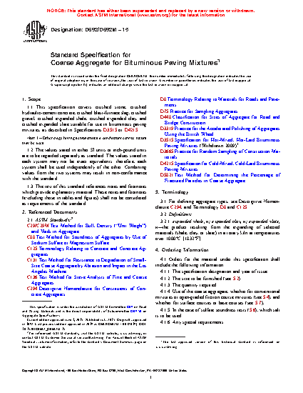1.1 This specification covers crushed stone, crushed hydraulic-cement concrete, crushed blast-furnace slag, crushed gravel, crushed expanded shale, crushed expanded clay, and crushed expanded slate suitable for use in bituminous paving mixtures, as described in Specifications D3515 or D4215.