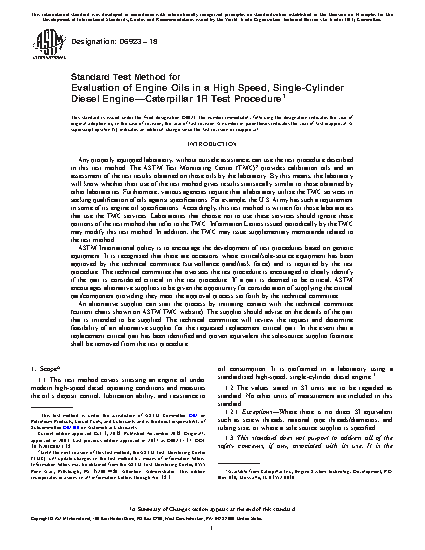 1.1 This test method covers stressing an engine oil under modern high-speed diesel operating conditions and measures the oil's deposit control, lubrication ability, and resistance to oil consumption. It is performed in a laboratory using a standardized high-speed, single-cylinder diesel engine.4