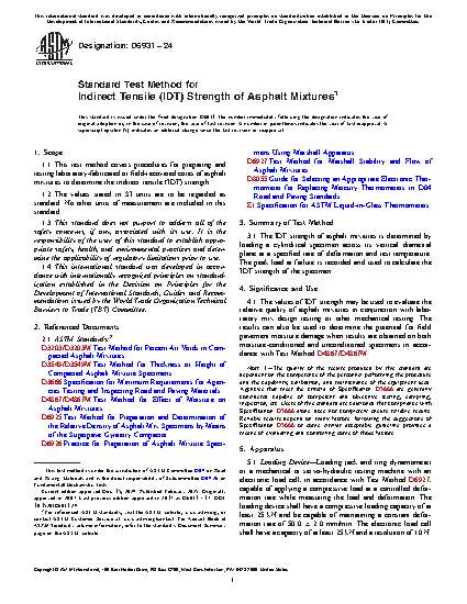 1.1 This test method covers procedures for preparing and testing laboratory-fabricated or field-recovered cores of asphalt mixtures to determine the indirect tensile (IDT) strength.