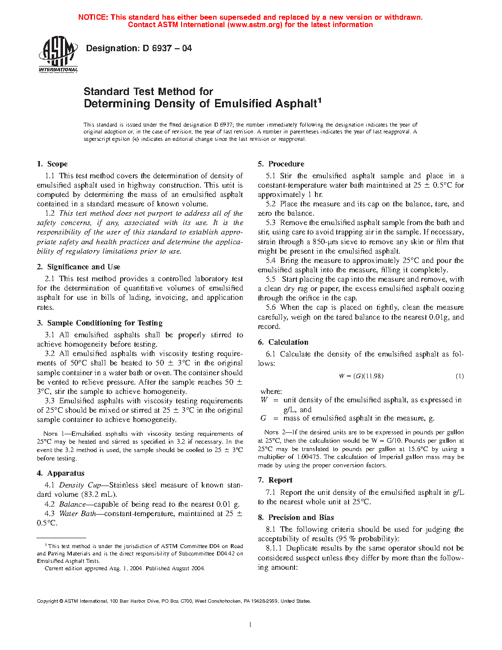 1.1 This test method covers the determination of density of emulsified asphalt used in highway construction. This unit is computed by determining the mass of an emulsified asphalt contained in a standard measure of known volume.