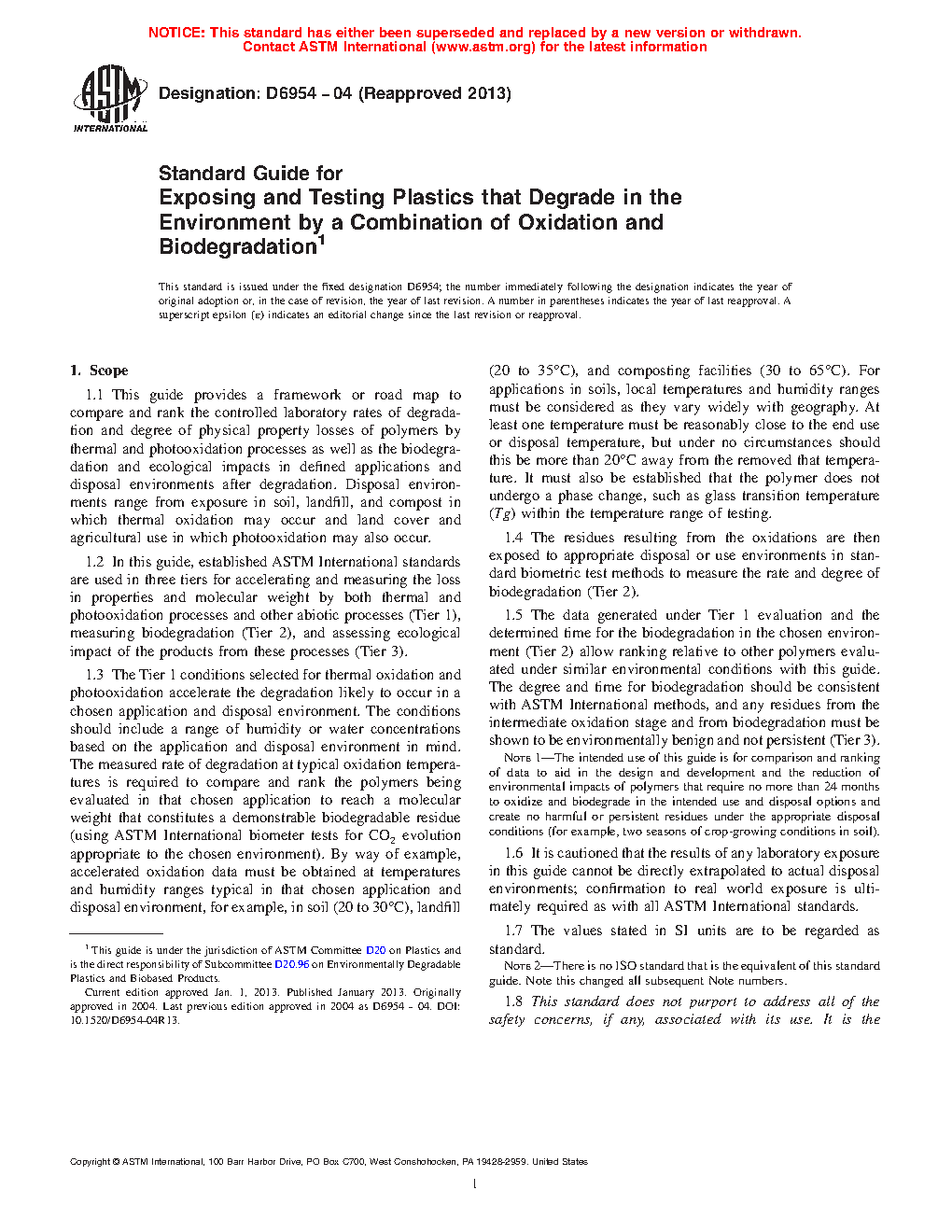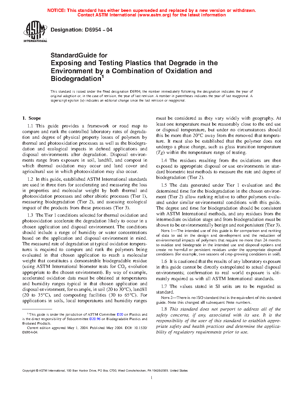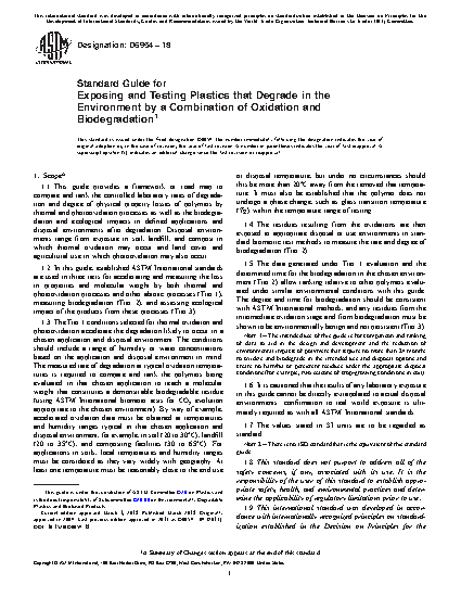 1.2 In this guide, established ASTM International standards are used in three tiers for accelerating and measuring the loss in properties and molecular weight by both thermal and photooxidation processes and other abiotic processes (Tier 1), measuring biodegradation (Tier 2), and assessing ecological impact of the products from these processes (Tier 3).