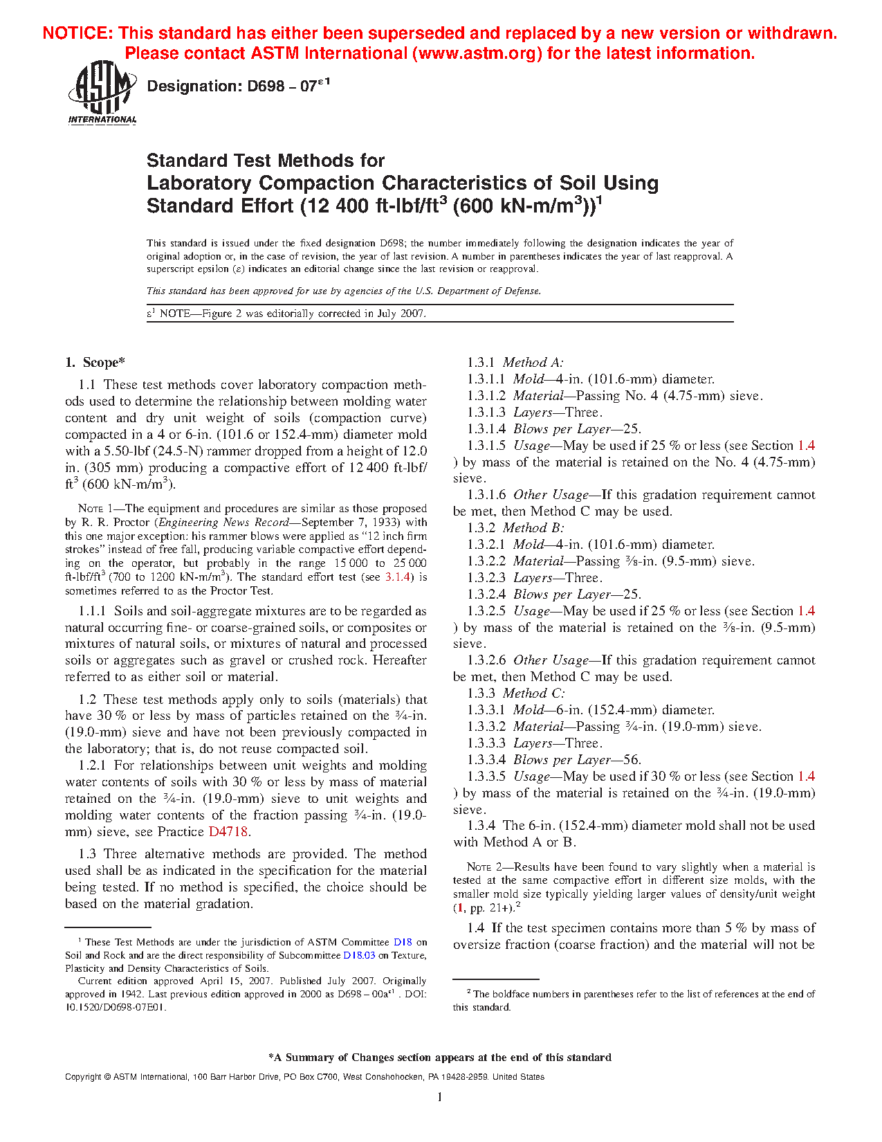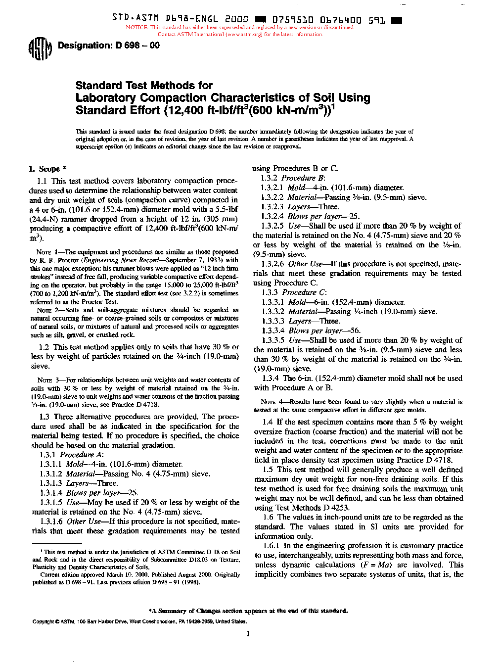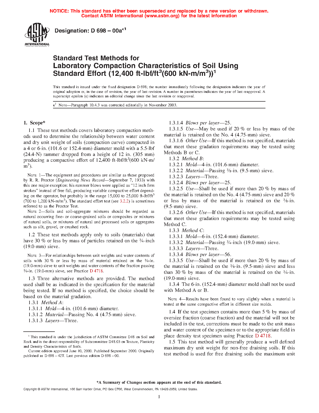1.1 These test methods cover laboratory compaction methods used to determine the relationship between molding water content and dry unit weight of soils (compaction curve) compacted in a 4 or 6-in. (101.6 or 152.4-mm) diameter mold with a 5.50-lbf (24.5-N) rammer dropped from a height of 12.0 in. (305 mm) producing a compactive effort of 12 400 ft-lbf/ft3 (600 kN-m/m3).