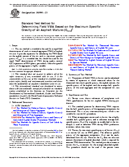 1.1 This test method is intended to be used for a rapid field determination of voids in mineral aggregate (VMA) of asphalt mixture. It provides equations for calculating the VMA based on the asphalt content of the mix and its maximum specific gravity (Gmm). It is intended that this should be used for the rapid “field” determination of VMA during quality control (QC) operations at HMA plants, particularly where the specific gravity of the aggregate is highly variable.