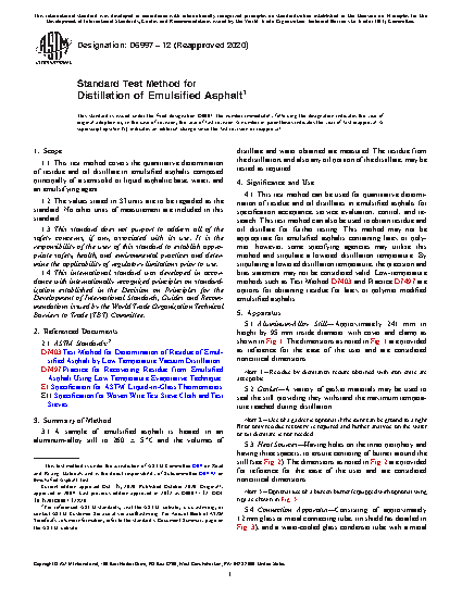 1.1 This test method covers the quantitative determination of residue and oil distillate in emulsified asphalts composed principally of a semisolid or liquid asphaltic base, water, and an emulsifying agent.