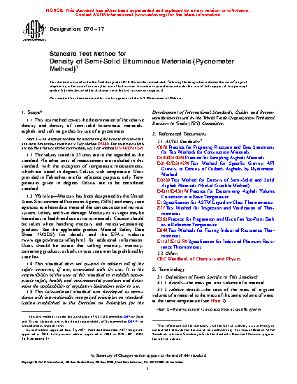 1.1 This test method covers the determination of the relative density and density of semi-solid asphalt binder and soft tar pitches by use of a pycnometer.