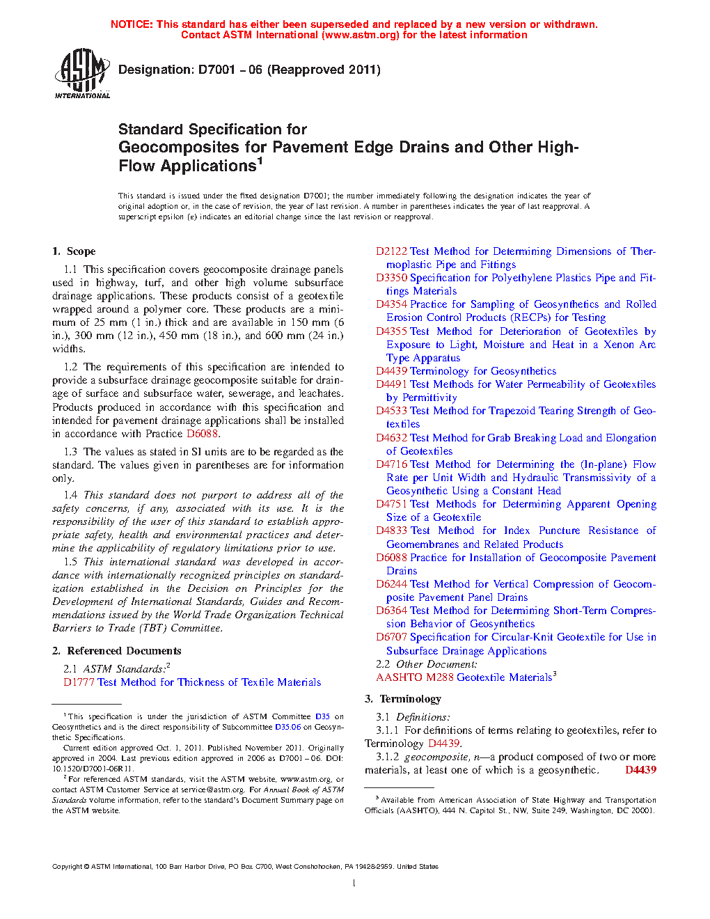 1.2 The requirements of this specification are intended to provide a subsurface drainage geocomposite suitable for drainage of surface and subsurface water, sewerage, and leachates. Products produced in accordance with this specification and intended for pavement drainage applications shall be installed in accordance with Practice D 6088.