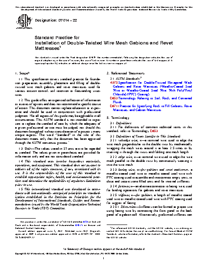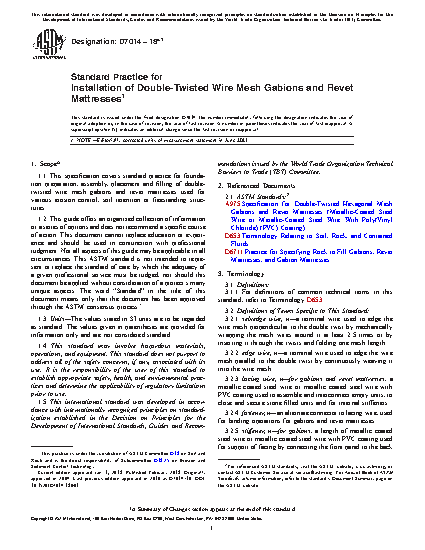 1.1 This specification covers standard practice for foundation preparation, assembly, placement and filling of double-twisted wire mesh gabions and revet mattresses used for various erosion control, soil retention or freestanding structures.