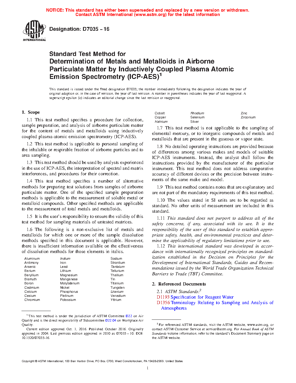 1.1 This test method specifies a procedure for collection, sample preparation, and analysis of airborne particulate matter for the content of metals and metalloids using inductively coupled plasma-atomic emission spectrometry (ICP-AES).