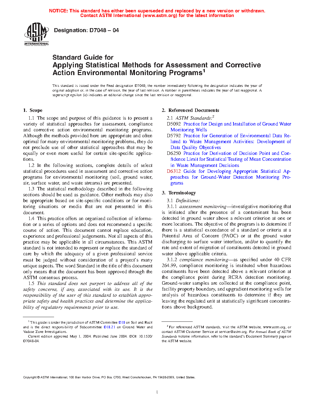5.4 Statistical methods for detection monitoring have been well studied in recent years (see Gibbons, 1994a, 1996, USEPA 1992 (2, 4, 5) and Practice D6312, formerly PS 64-96 authored by Gibbons, Brown and Cameron, 1996). Although equally important, statistical methods for assessment monitoring, Phase I and II Investigations, on-going monitoring and corrective action monitoring have received less attention, (Gibbons and Coleman, 2001) (6).