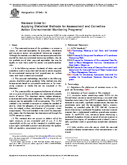 1.1 The scope and purpose of this guidance is to present a variety of statistical approaches for assessment, compliance and corrective action environmental monitoring programs. Although the methods provided here are appropriate and often optimal for many environmental monitoring problems, they do not preclude use of other statistical approaches that may be equally or even more useful for certain site-specific applications.