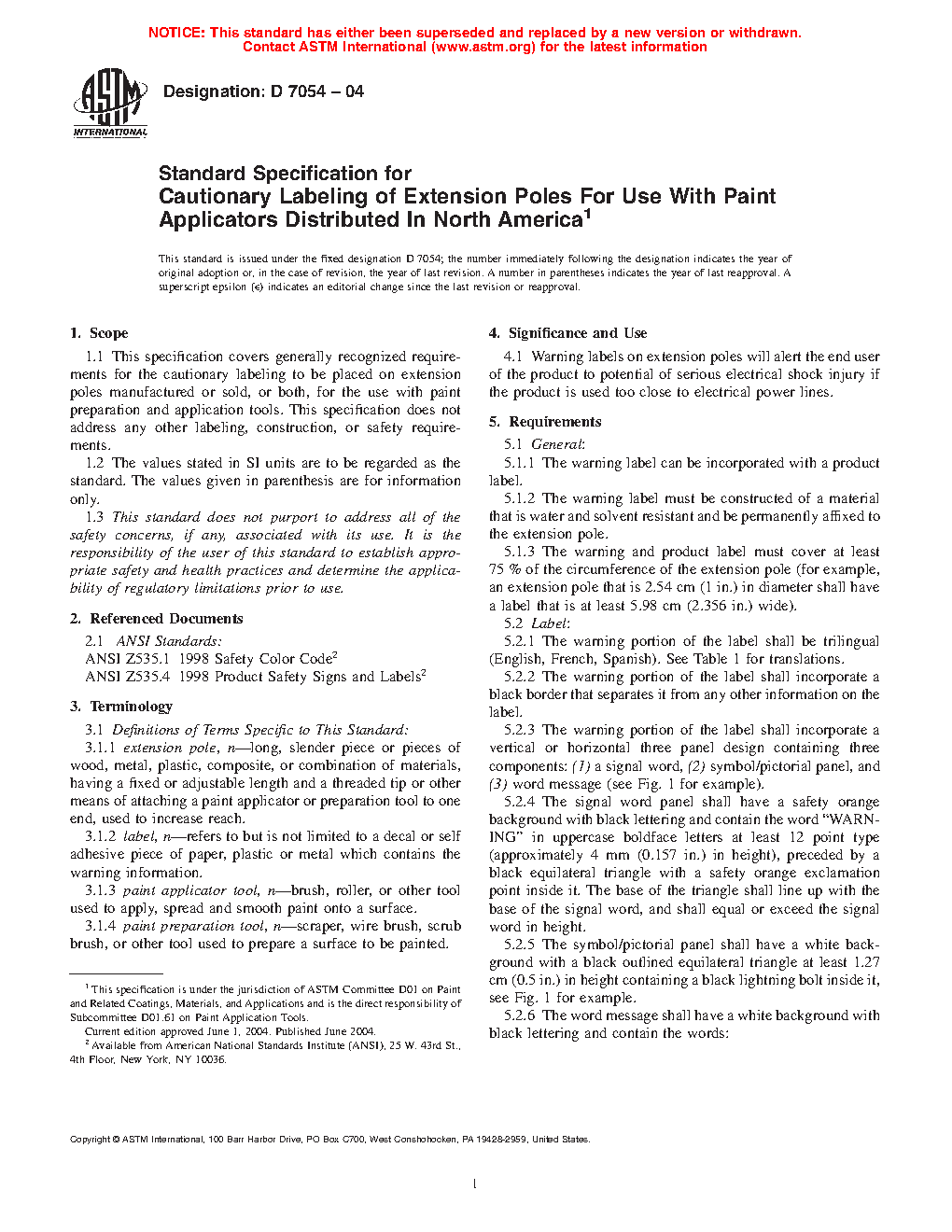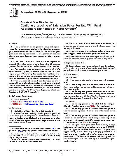 1.1 This specification covers generally recognized requirements for the cautionary labeling to be placed on extension poles manufactured or sold, or both, for the use with paint preparation and application tools. This specification does not address any other labeling, construction, or safety requirements.