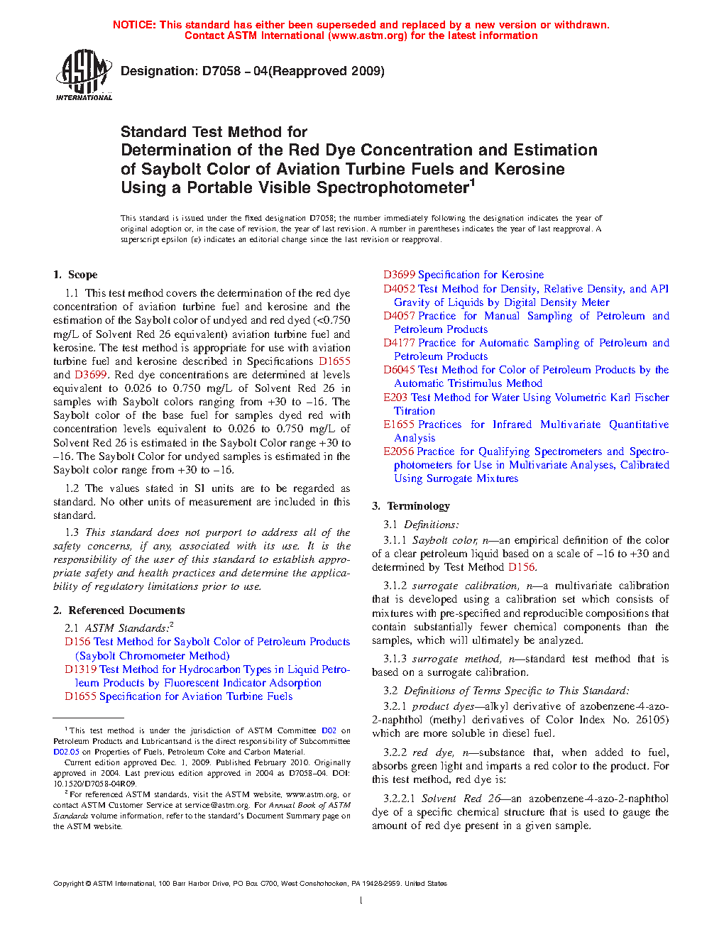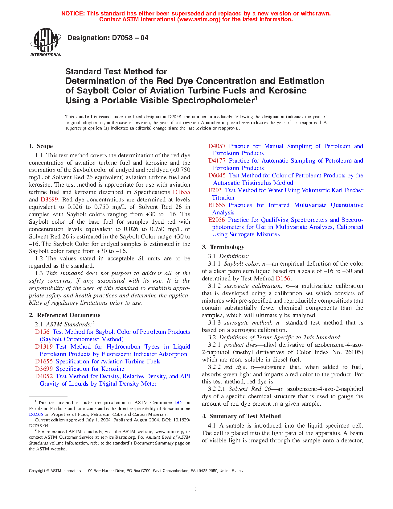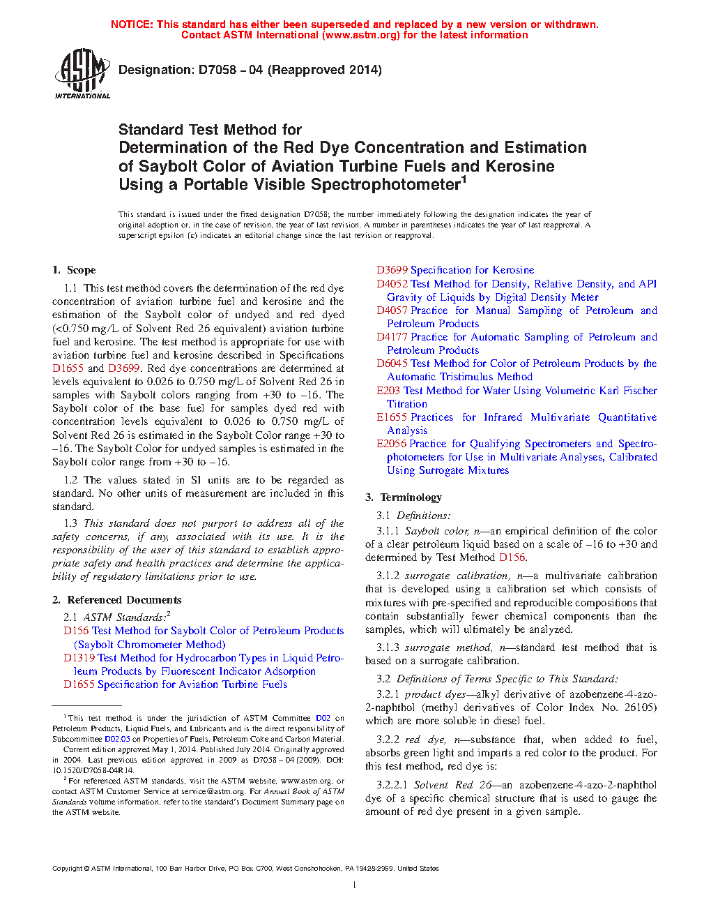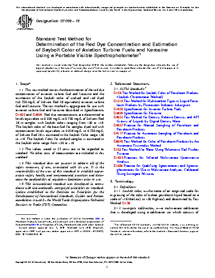 1.1 This test method covers the determination of the red dye concentration of aviation turbine fuel and kerosine and the estimation of the Saybolt color of undyed and red dyed (<0.750 mg/L of Solvent Red 26 equivalent) aviation turbine fuel and kerosine. The test method is appropriate for use with aviation turbine fuel and kerosine described in Specifications D1655 and D3699. Red dye concentrations are determined at levels equivalent to 0.026 to 0.750 mg/L of Solvent Red 26 in samples with Saybolt colors ranging from +30 to –16. The Saybolt color of the base fuel for samples dyed red with concentration levels equivalent to 0.026 to 0.750 mg/L of Solvent Red 26 is estimated in the Saybolt Color range +30 to –16. The Saybolt Color for undyed samples is estimated in the Saybolt color range from +30 to –16.