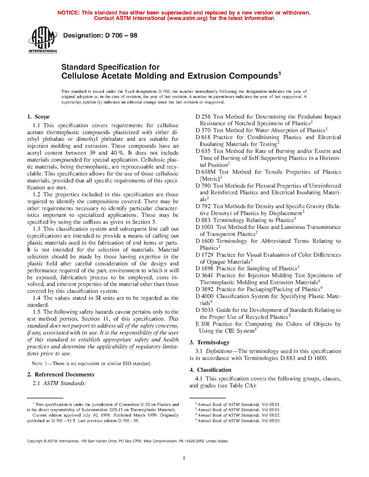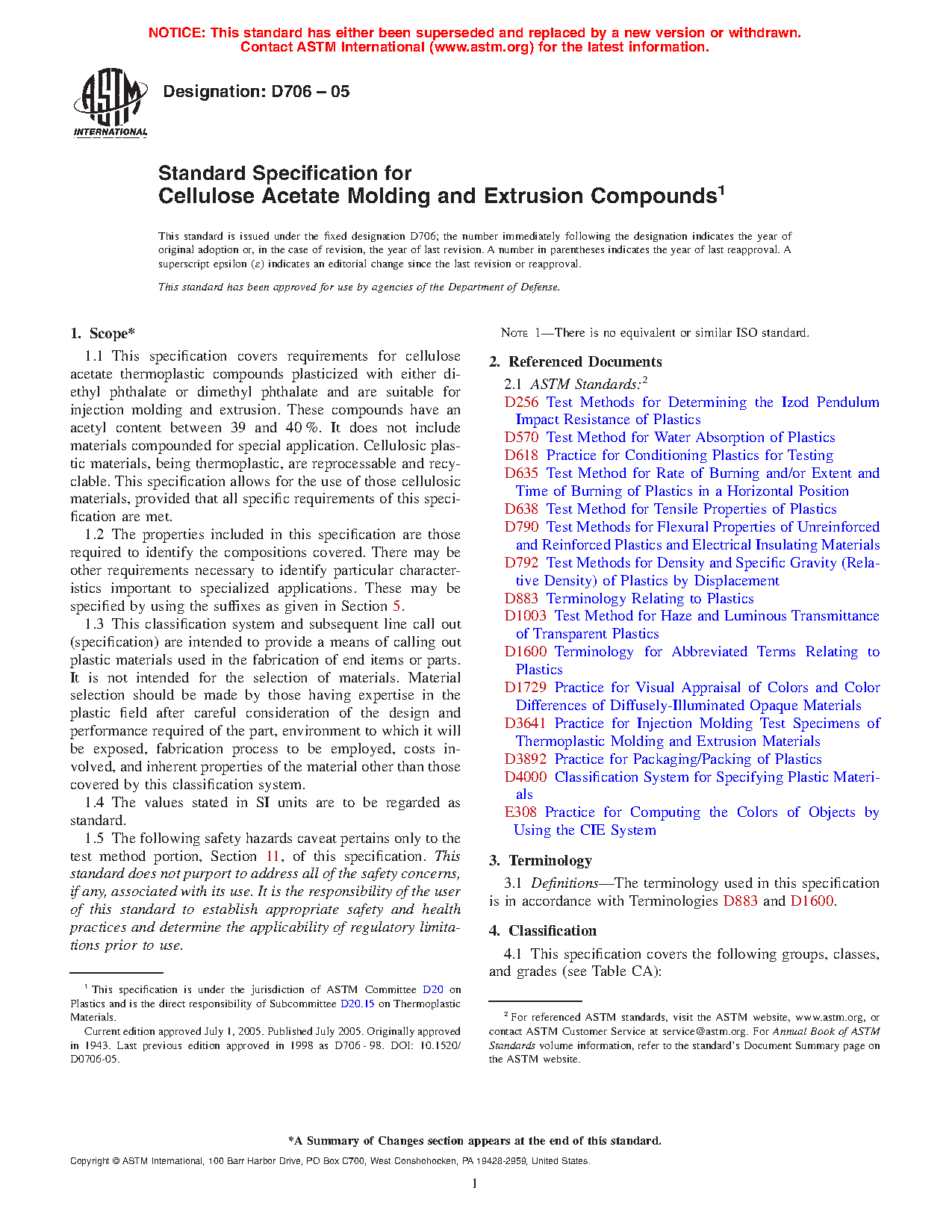 1.1 This classification system covers requirements for cellulose acetate thermoplastic compounds plasticized with either diethyl phthalate or dimethyl phthalate and are suitable for injection molding and extrusion. These compounds have an acetyl content between 39 and 40 %. It does not include materials compounded for special application. Cellulosic plastic materials, being thermoplastic, are reprocessable and recyclable. This classification system allows for the use of those cellulosic materials, provided that all specific requirements of this classification system are met.