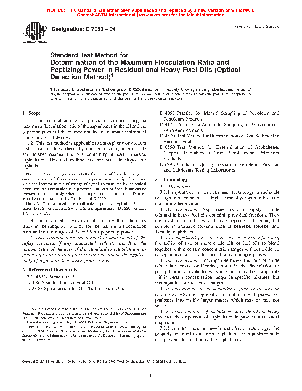 1.1 This test method covers a procedure for quantifying the maximum flocculation ratio of the asphaltenes in the oil and the peptizing power of the oil medium, by an automatic instrument using an optical device.