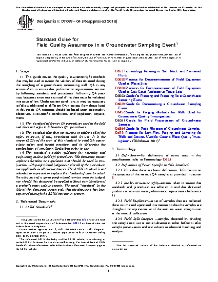 1.1 This guide covers the quality assurance (QA) methods that may be used to assure the validity of data obtained during the sampling of a groundwater monitoring well. QA is any action taken to ensure that performance requirements are met by following standards and procedures. Following QA practices becomes even more critical if the data must be validated in a court of law. Under certain conditions, it may be necessary to follow additional or different QA practices from those listed in this guide. QA practices should be based upon data quality objectives, site-specific conditions, and regulatory requirements.