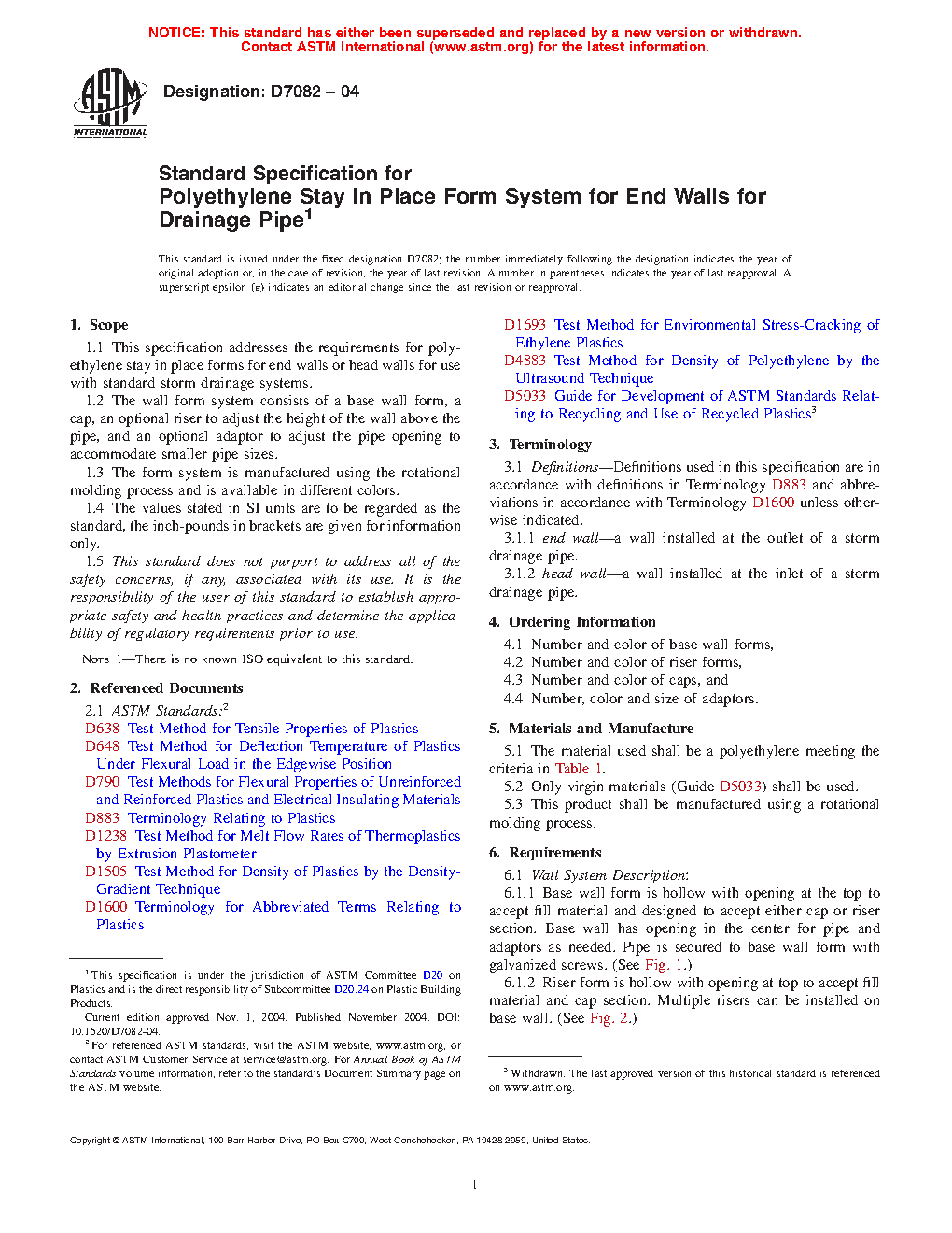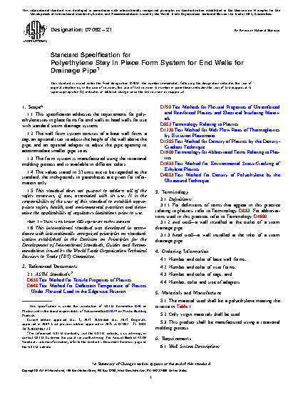 This specification addresses the requirements for polyethylene stay in place forms for end walls or head walls for use with standard storm drainage systems. The wall form system consists of a base wall form, a cap, an optional riser to adjust the height of the wall above the pipe, and an optional adaptor to adjust the pipe opening to accommodate smaller pipe sizes. The form system is manufactured using the rotational molding process and is available in different colors. The plastic shall be tested for its deflection temperature, flexural properties, melt flow rate, and density.