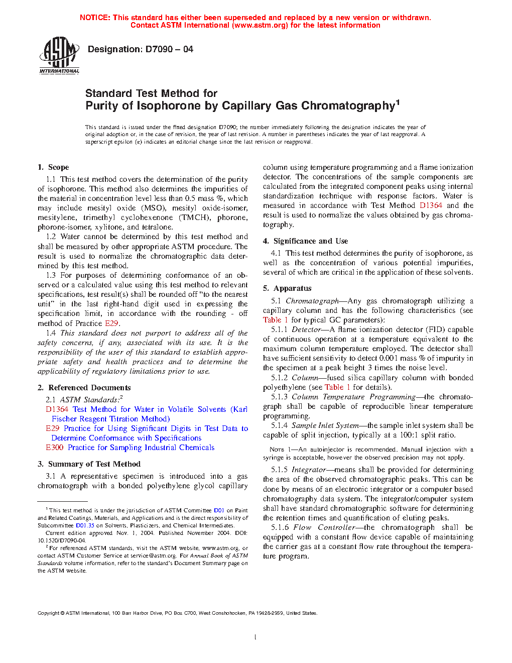 1.1 This test method covers the determination of the purity of isophorone. This method also determines the impurities of the material in concentration level less than 0.5 mass %, which may include mesityl oxide (MSO), mesityl oxide-isomer, mesitylene, trimethyl cyclohexenone (TMCH), phorone, phorone-isomer, xylitone, and tetralone.