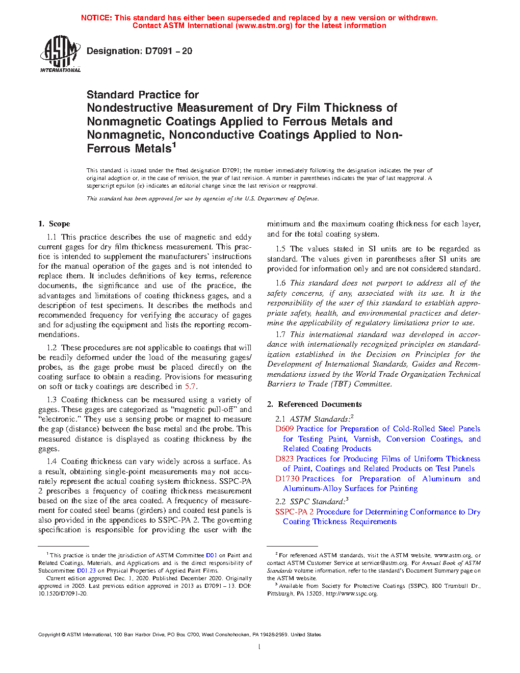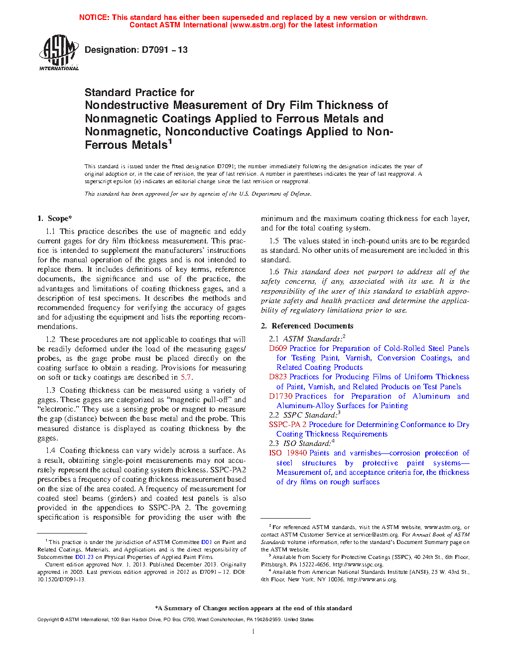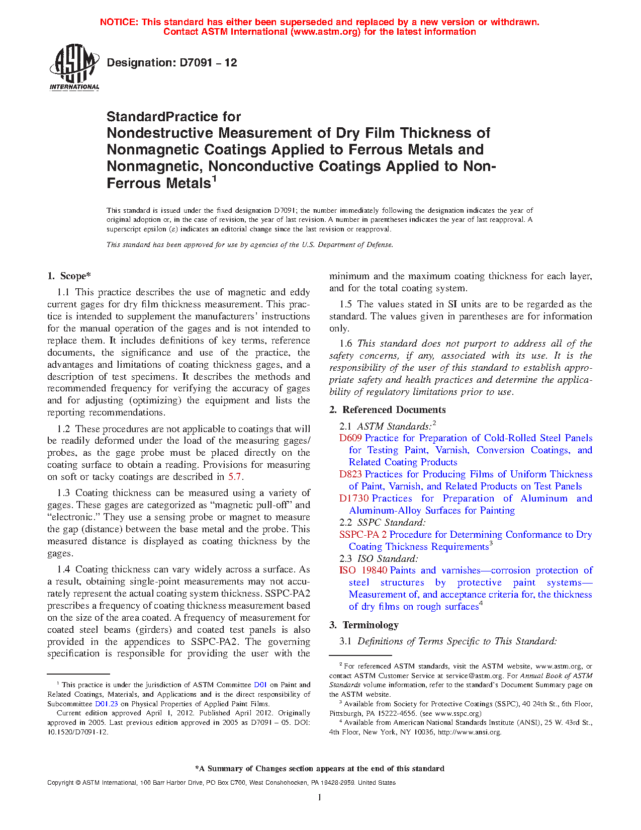 1.4 Coating thickness can vary widely across a surface. As a result, obtaining single-point measurements may not accurately represent the actual coating system thickness. SSPC-PA 2 prescribes a frequency of coating thickness measurement based on the size of the area coated. A frequency of measurement for coated steel beams (girders) and coated test panels is also provided in the appendices to SSPC-PA 2. The governing specification is responsible for providing the user with the minimum and the maximum coating thickness for each layer, and for the total coating system.