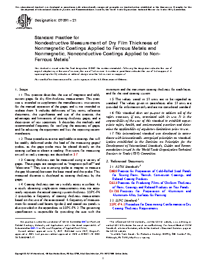 1.1 This practice describes the use of magnetic and eddy current gages for dry film thickness measurement. This practice is intended to supplement the manufacturers’ instructions for the manual operation of the gages and is not intended to replace them. It includes definitions of key terms, reference documents, the significance and use of the practice, the advantages and limitations of coating thickness gages, and a description of test specimens. It describes the methods and recommended frequency for verifying the accuracy of gages and for adjusting the equipment and lists the reporting recommendations.