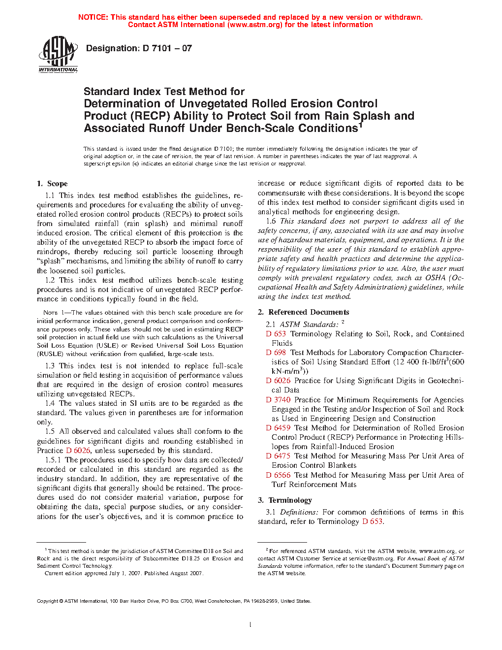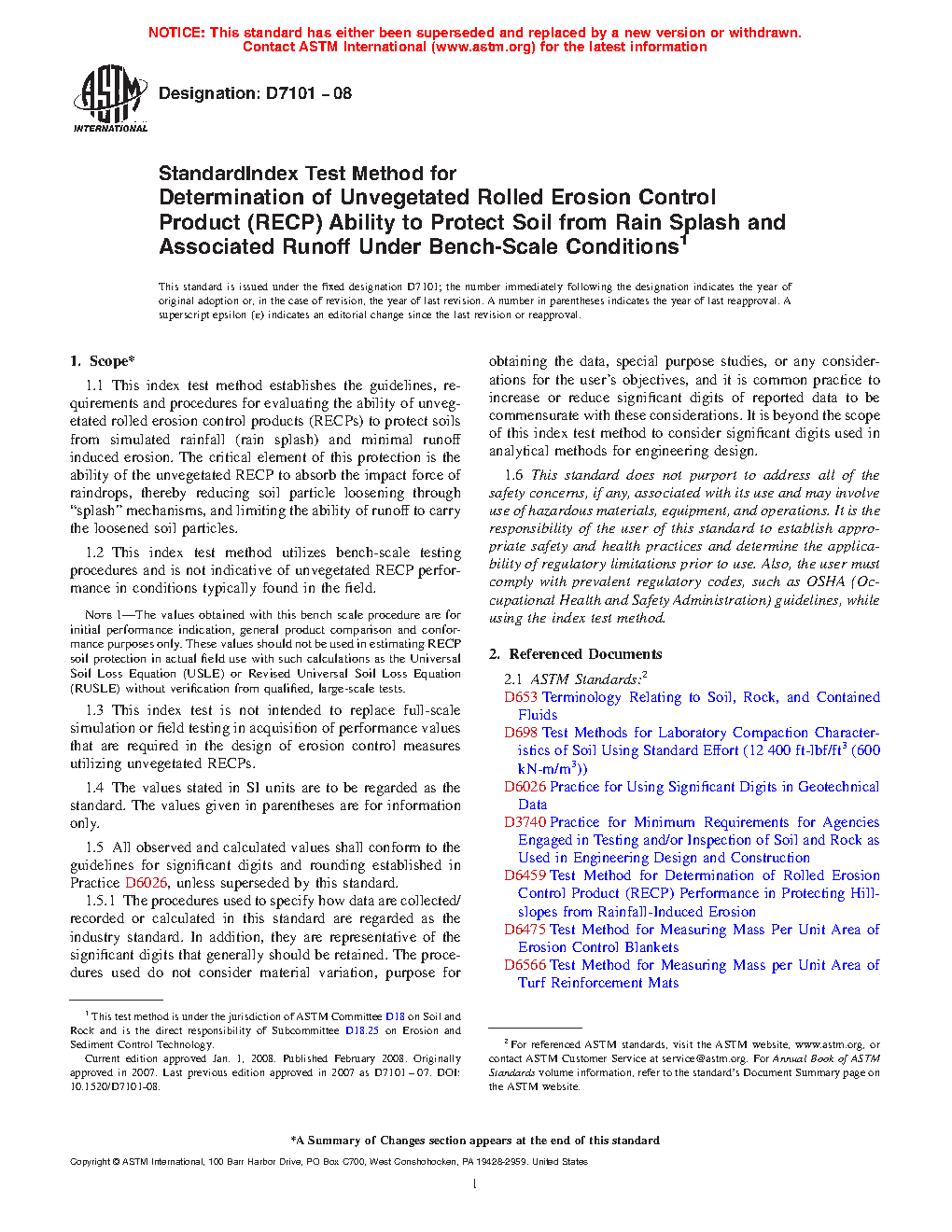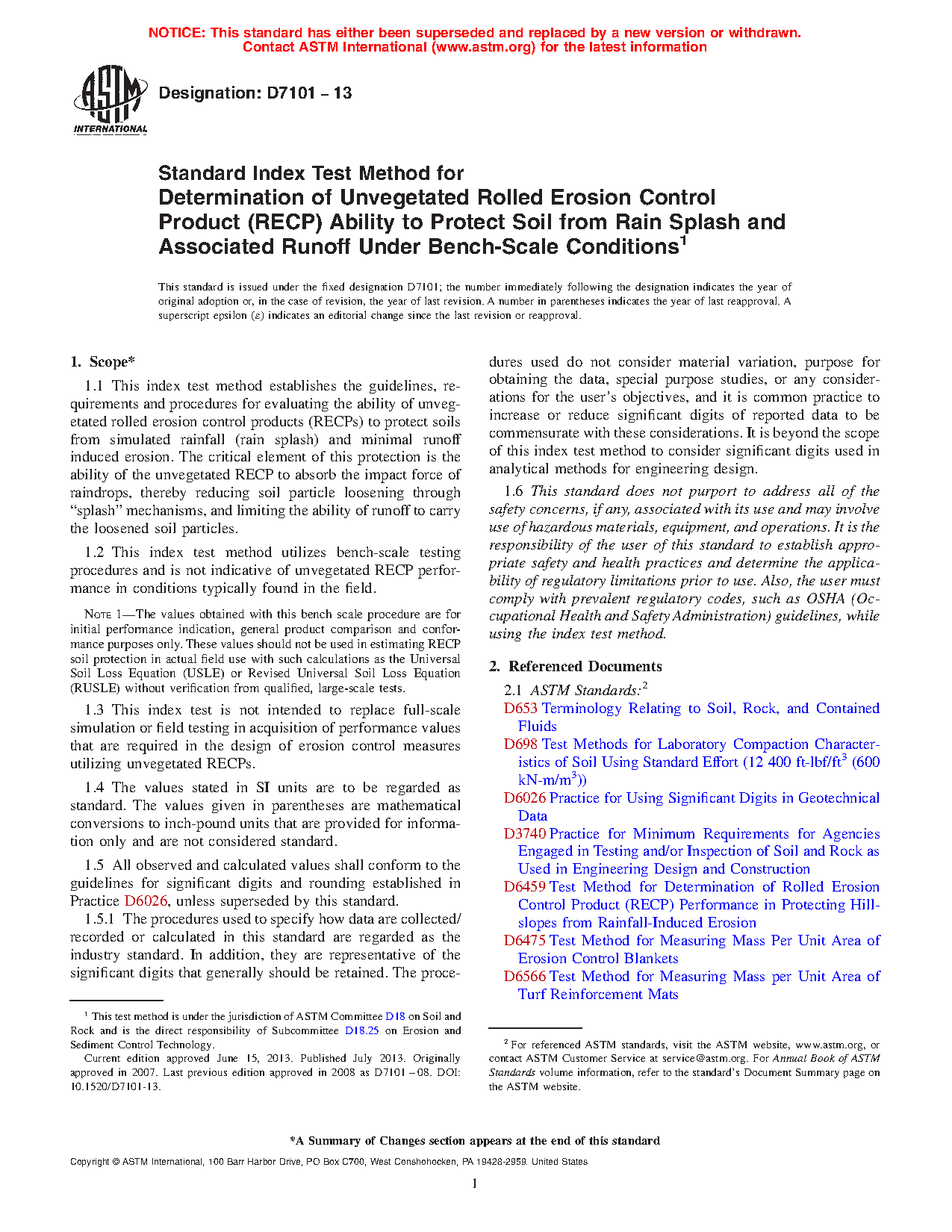 1.1 This index test method establishes the guidelines, requirements and procedures for evaluating the ability of unvegetated rolled erosion control products (RECPs) to protect soils from simulated rainfall (rain splash) and minimal runoff induced erosion. The critical element of this protection is the ability of the unvegetated RECP to absorb the impact force of raindrops, thereby reducing soil particle loosening through “splash” mechanisms, and limiting the ability of runoff to carry the loosened soil particles.