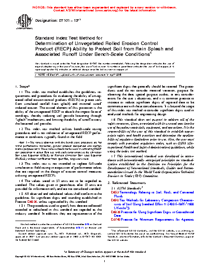 5.1 This index test method indicates a unvegetated RECP’s ability to reduce rainsplash-induced erosion under bench-scale conditions. This test method may also assist in identifying physical attributes of RECPs that contribute to their erosion-control performance.