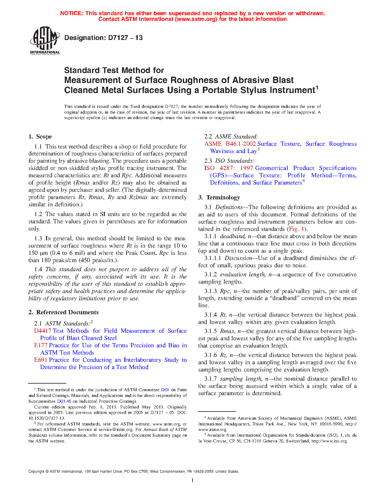 1.1 This test method describes a shop or field procedure for determination of roughness characteristics of surfaces prepared for painting by abrasive blasting. The procedure uses a portable skidded or non-skidded stylus profile tracing instrument. The measured characteristics are: Rt and Rpc. Additional measures of profile height (Rmax and/or Rz) may also be obtained as agreed upon by purchaser and seller. (The digitally-determined profile parameters Rt, Rmax, Ry and Rzlmax are extremely similar in definition.)