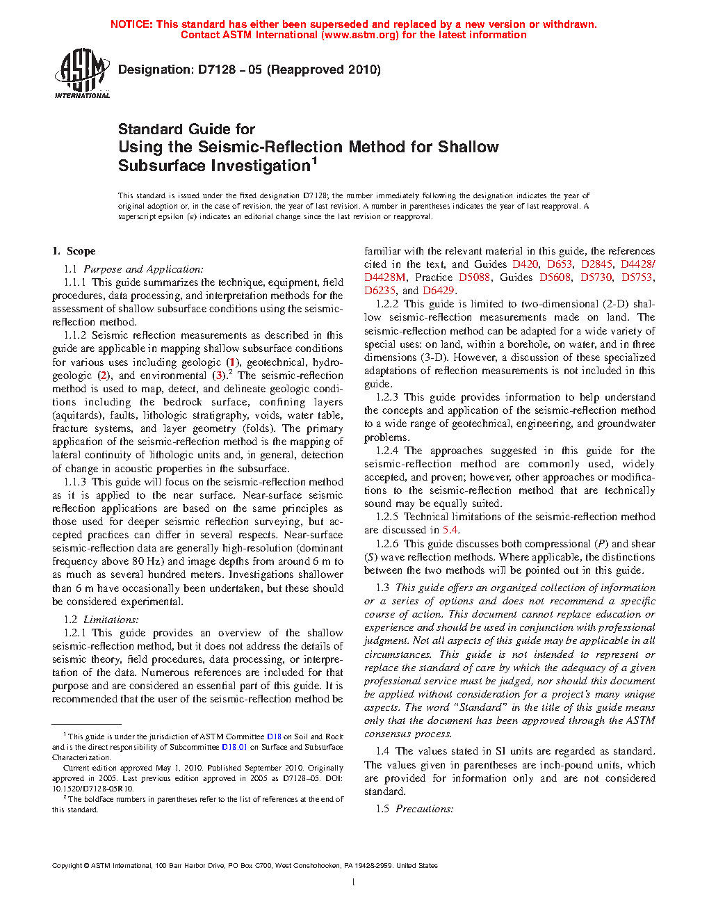 1.2.1 This guide provides an overview of the shallow seismic-reflection method, but it does not address the details of seismic theory, field procedures, data processing, or interpretation of the data. Numerous references are included for that purpose and are considered an essential part of this guide. It is recommended that the user of the seismic-reflection method be familiar with the relevant material in this guide, the references cited in the text, and Guides D 420, D 653, D 2845, D 4428/D 4428M, Practice D 5088, Guides D 5608, D 5730, D 5753, D 6235, and D 6429.